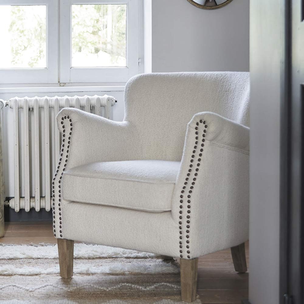 Concedetevi un momento di relax sulla poltrona CLAUDE color crema. Il suo tessuto bouclette le conferisce un tocco caldo e originale che si abbina facilmente a tutti gli stili di arredamento. L'ampia seduta e i braccioli arrotondati la rendono una poltrona generosa e confortevole.