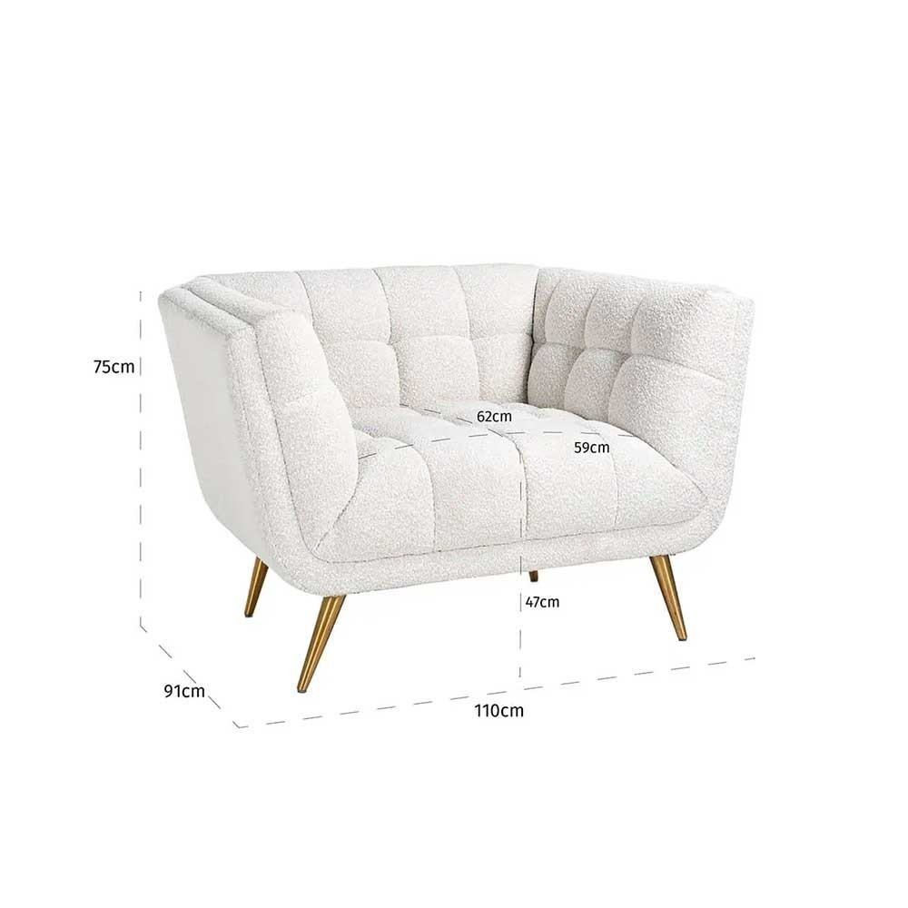 La poltrona Huxley, rivestita in un sontuoso tessuto bouclé bianco e caratterizzata da un'elegante base dorata, vi affascinerà con la sua seduta ultra-confortevole e la sua forma avvolgente, creando un'atmosfera elegante e calda nella vostra casa.