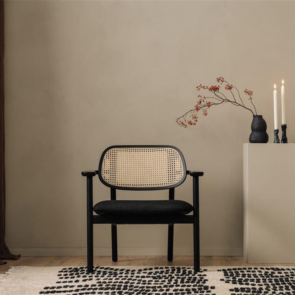 La poltrona Titus ha una seduta profonda e confortevole e uno schienale in canna. La luce e l'aria possono circolare attraverso la superficie in vimini, proiettando un'ombra finemente modellata nella stanza. Disponibile con struttura in rovere nero o rovere naturale.