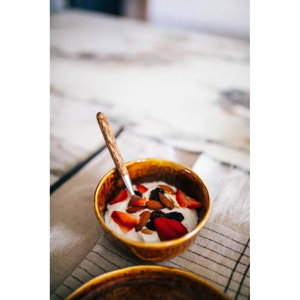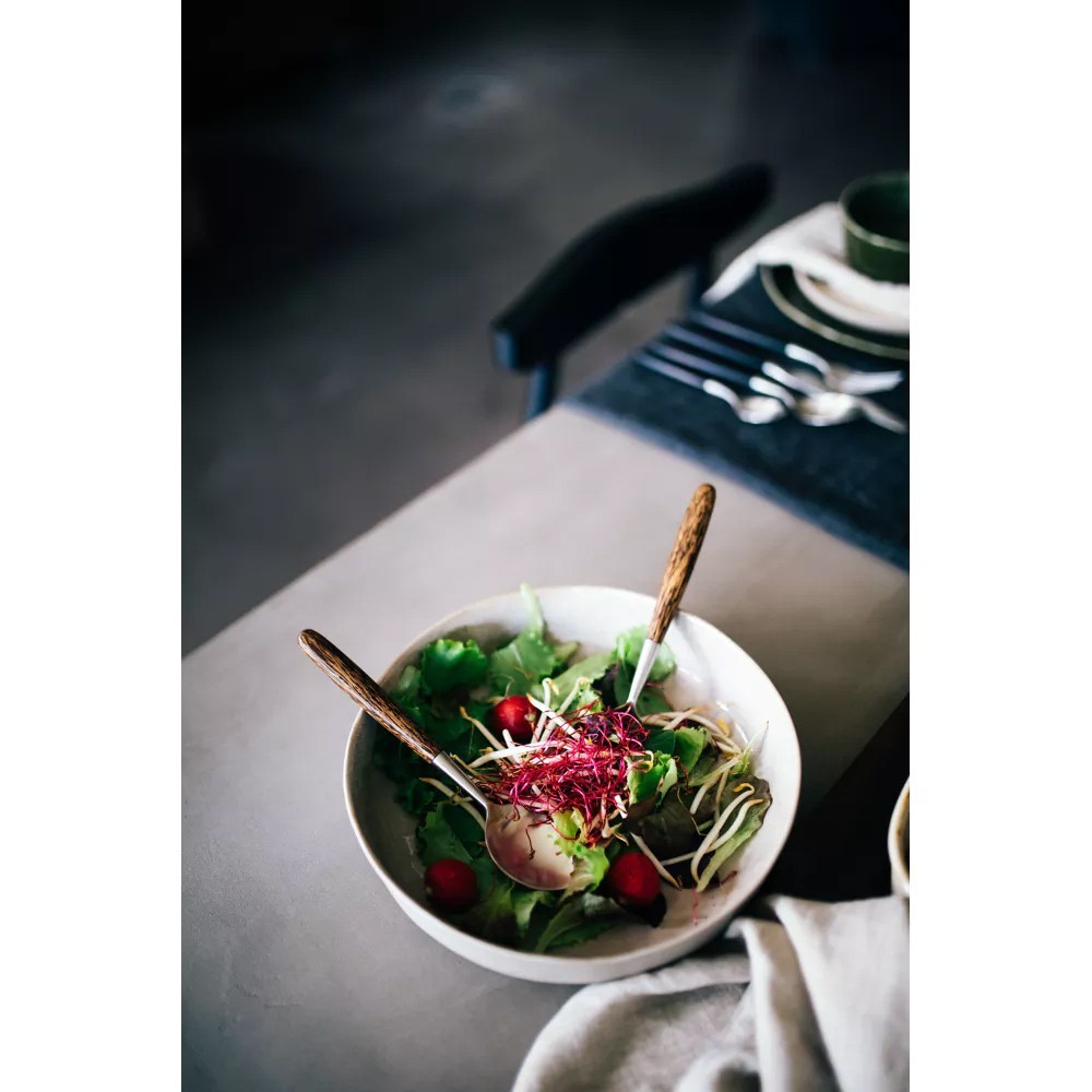 Realizzati in acciaio inossidabile, le forchette, i coltelli e i cucchiai di questo set sono impreziositi da manici in legno di palma. Per questo motivo, si consiglia di lavarli a mano per prolungarne la lucentezza.