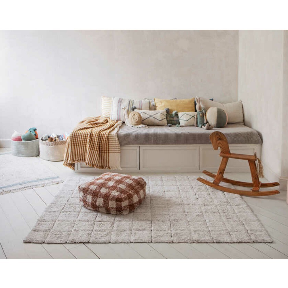 Scegliete il pouf quadrato Vichy di Lorena Canals, ispirato alla biancheria da tavola e caratterizzato dal classico motivo Vichy in tonalità vintage. Il rivestimento è realizzato con un corto pelo di cotone tufted su una tela di cotone riciclato ed è sfoderabile con una cerniera per il lavaggio.