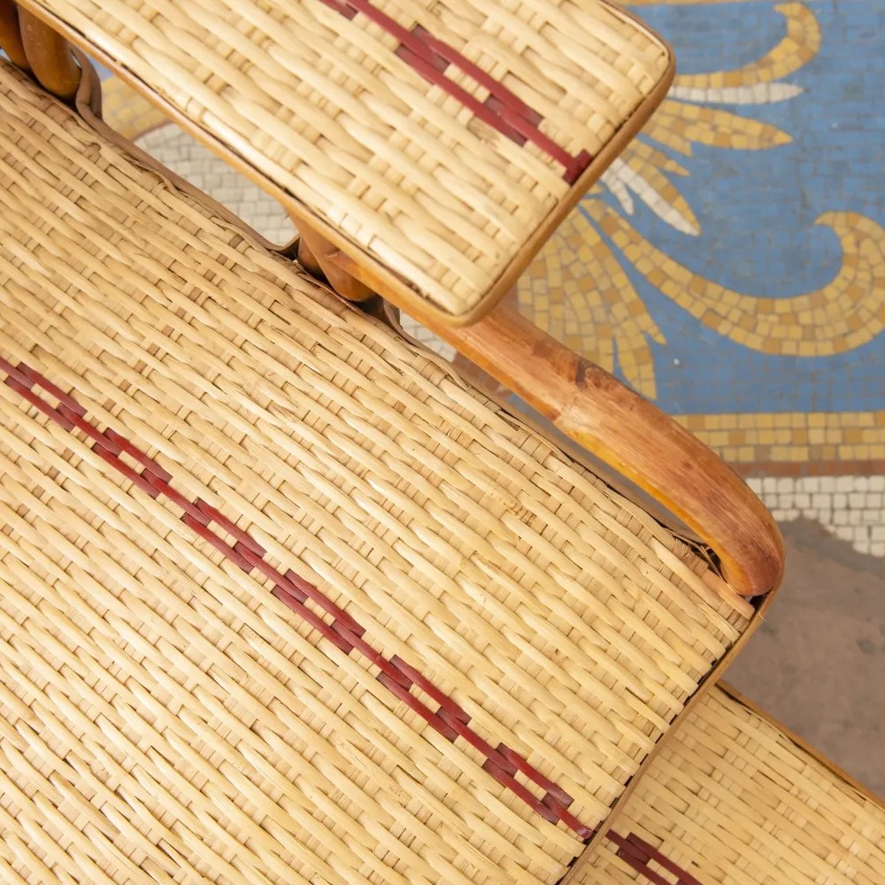 La chaise longue in rattan intrecciato Bagatelle è una fedele riedizione di un modello d'epoca ritrovato negli archivi di un vecchio catalogo KOK. Ispirata allo stile Belle Époque, presenta dettagli autentici come la rete rossa, il telaio in rattan Malacca marrone scuro e la seduta curva che si modella alla forma del corpo per un maggiore comfort.