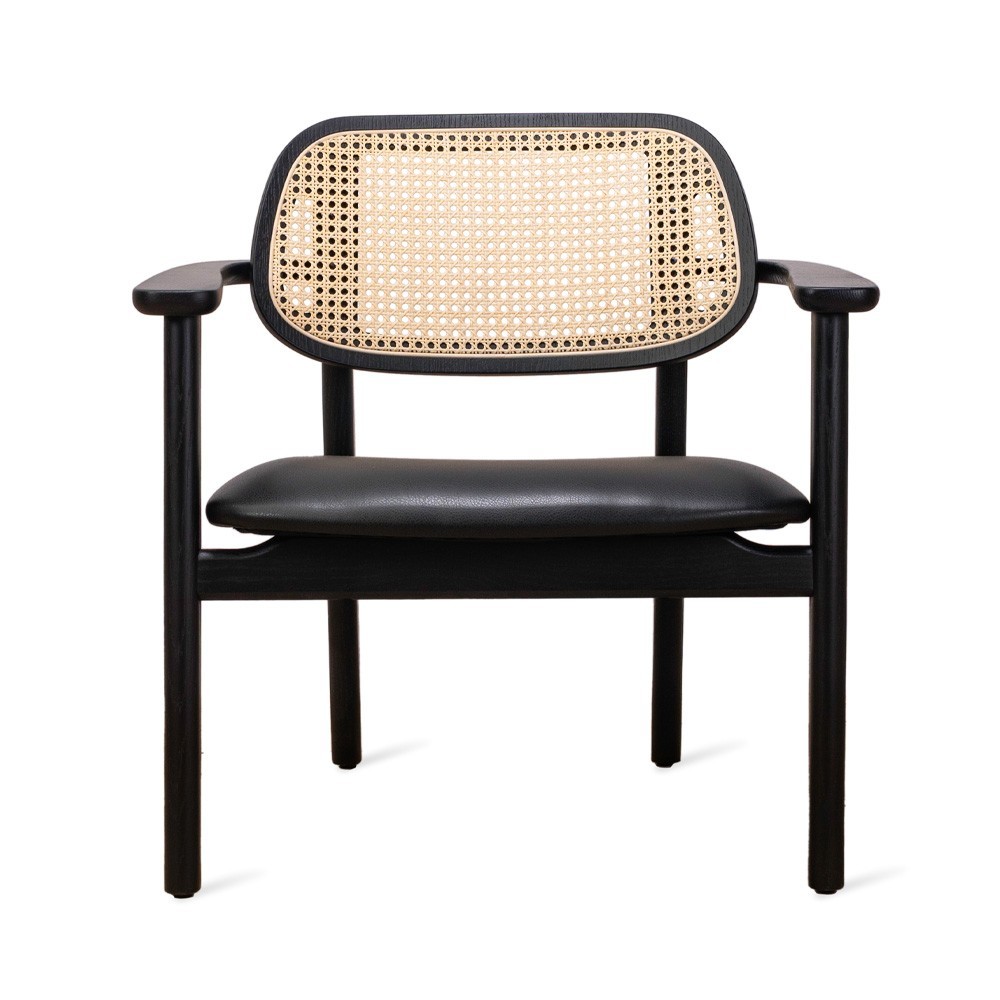 - Canna intrecciata su struttura in rovere tinto nero con sedile rivestito in finta pelle nera | Piedini in nylon nero