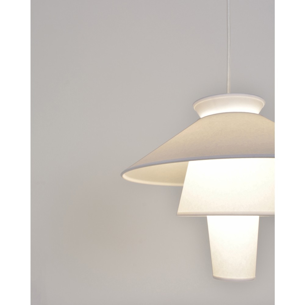 In uno stile di design con influenze scandinave, questo accumulo di paralumi evoca la forma di un alveare stilizzato. I coni giocano con la luce, diffondendola o riflettendola sulla superficie liscia e morbida dei materiali.