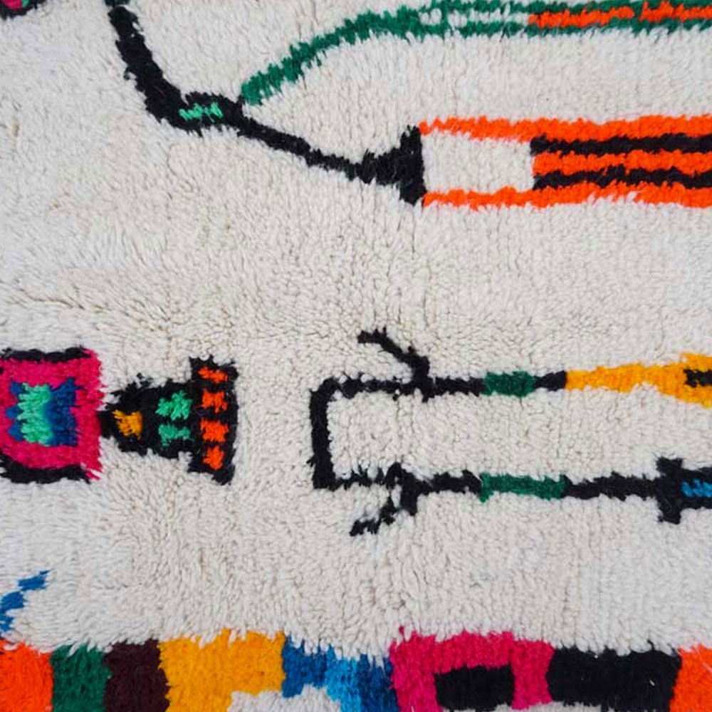 Questo tappeto chiamato Azilal prende il nome dalla regione di Azilal nelle montagne dell'Atlante in Marocco dove è stato realizzato. Ogni pezzo è realizzato a mano al 100% su un telaio tradizionale. Occorrono più di due mesi di tessitura per realizzare un tappeto di medie dimensioni.