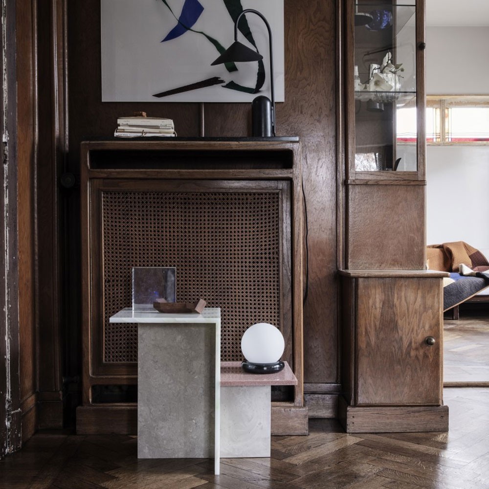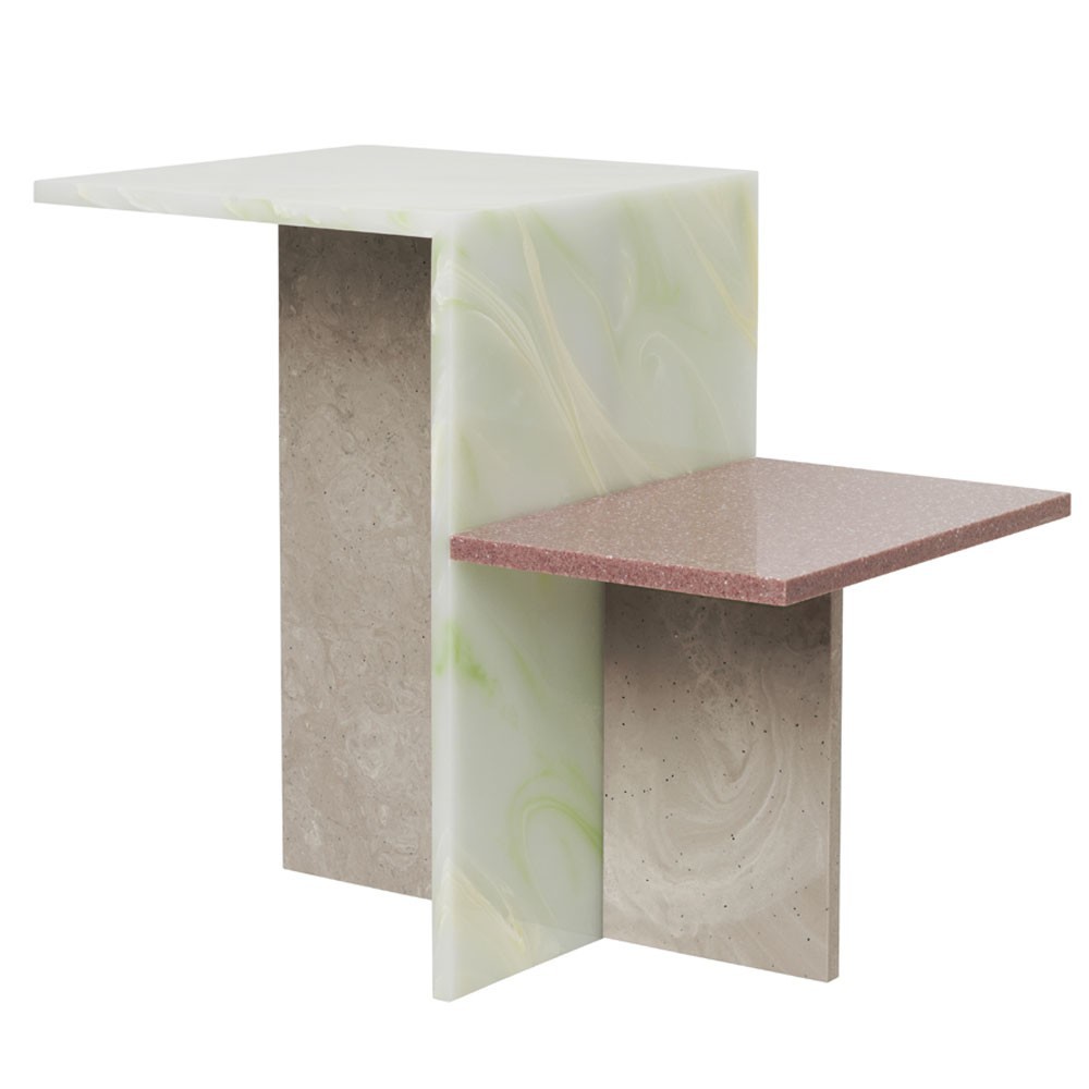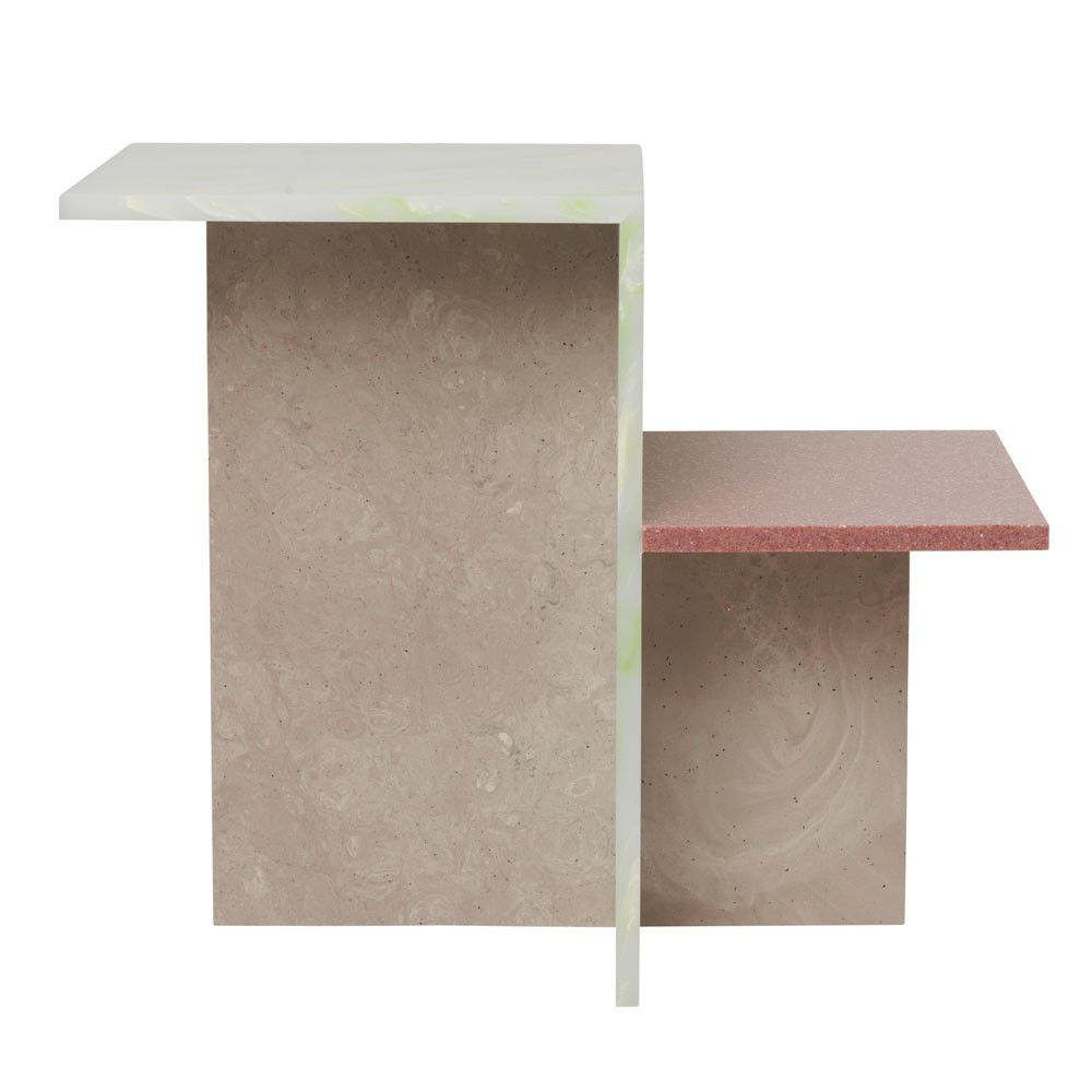 Originariamente ispirato al minimalismo giapponese, il tavolino Distinct esplora la creazione di strutture complesse basate su un unico elemento. Il minimalismo della sua costruzione crea un contrasto con la ricchezza di texture e colori e richiama una neoplastica astratta che accentua la composizione complessiva del tavolino. Il tavolo è realizzato in pietra acrilica.