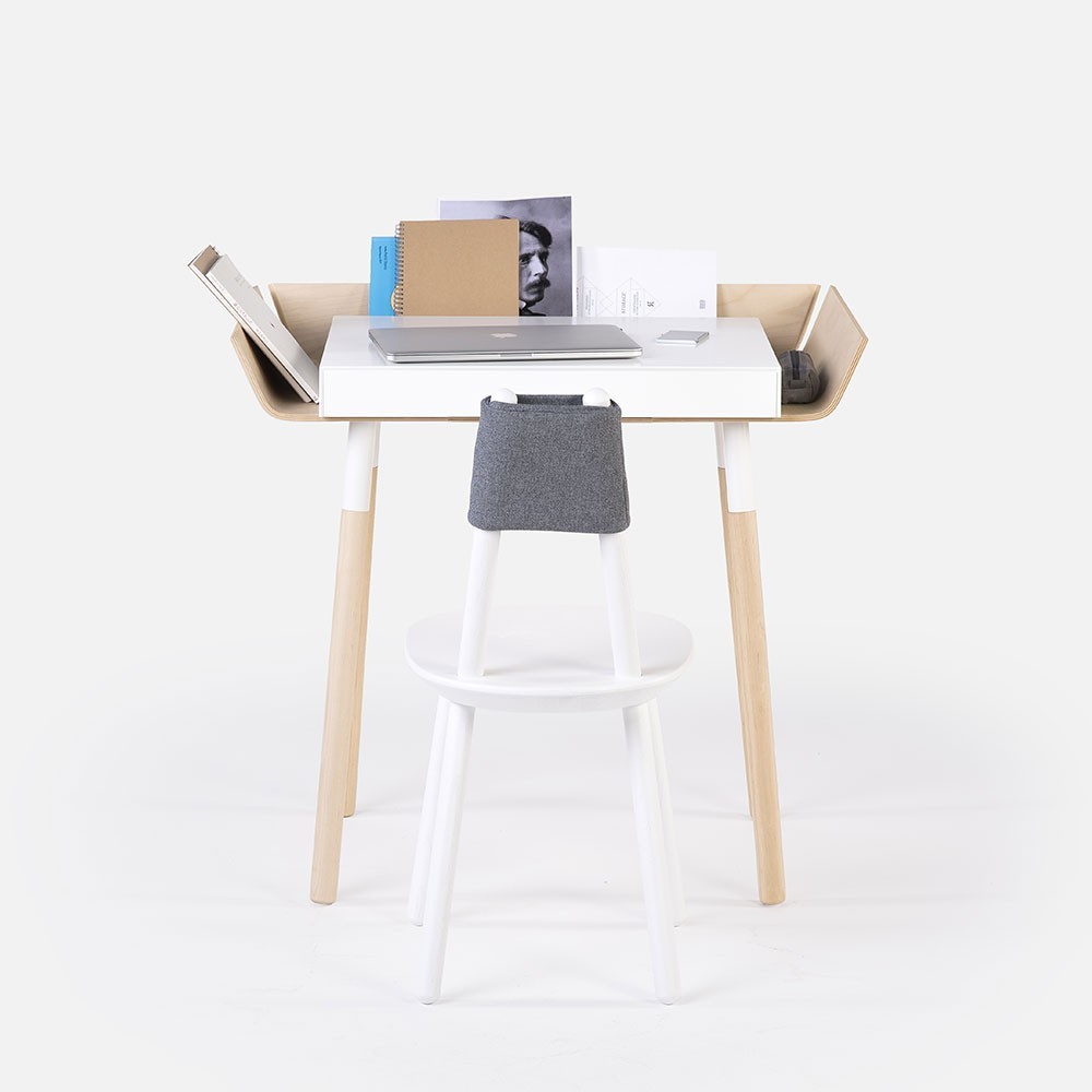 La scrivania bianca My Writing Desk, disegnata da EMKO, rivela spazi di contenimento intelligenti. Il suo cassetto nascosto sotto il piano in MDF e la sua "grondaia" sul lato della scrivania lo rendono un pezzo essenziale.