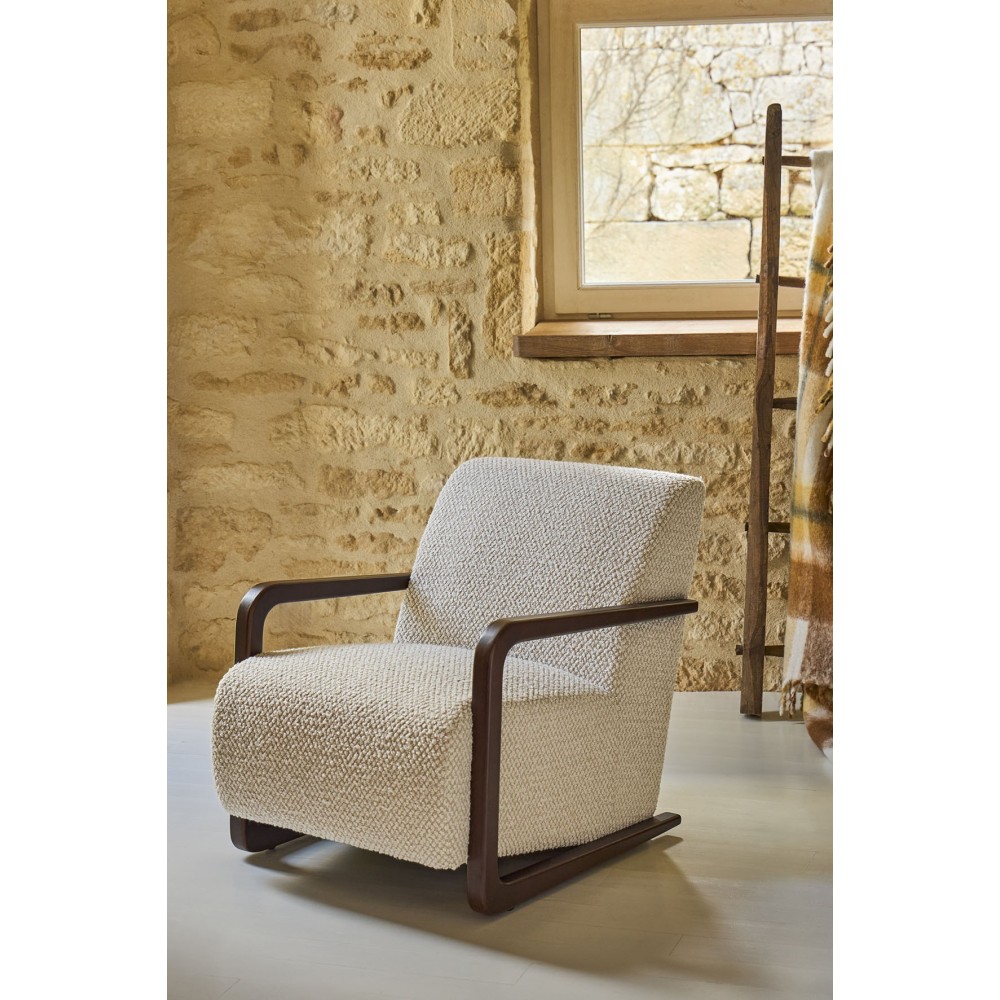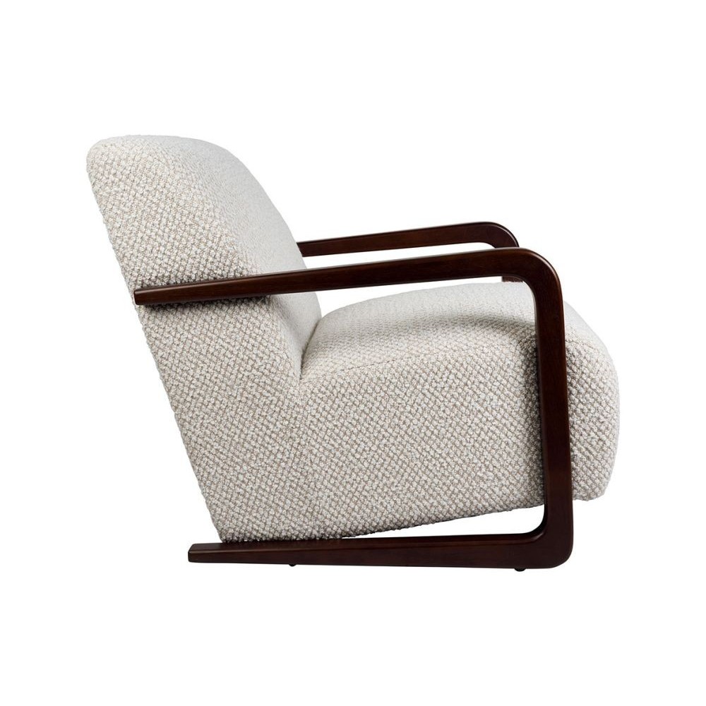 Hij is bekleed met een ecru bouclette stof met een zacht, omhullend gevoel en is net zo aantrekkelijk vanwege zijn trendy uiterlijk als vanwege zijn comfortabele zitplaatsen.
