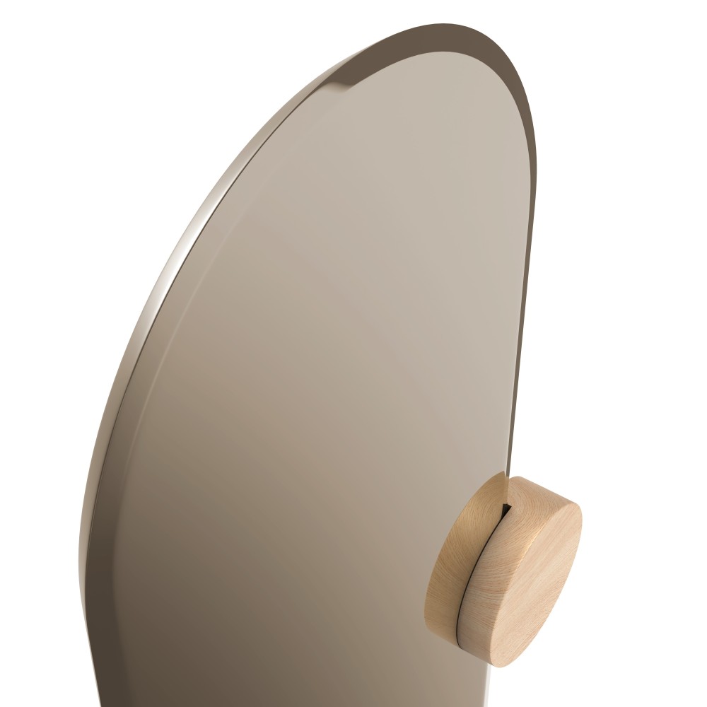 De Sonia spiegel is gemaakt in Portugal, van licht gerookt glas met een vleugje massief eikenhout. Hij hangt aan de muur met behulp van een klamp en kan horizontaal of verticaal worden geplaatst zonder de oriëntatie van de klamp te veranderen.