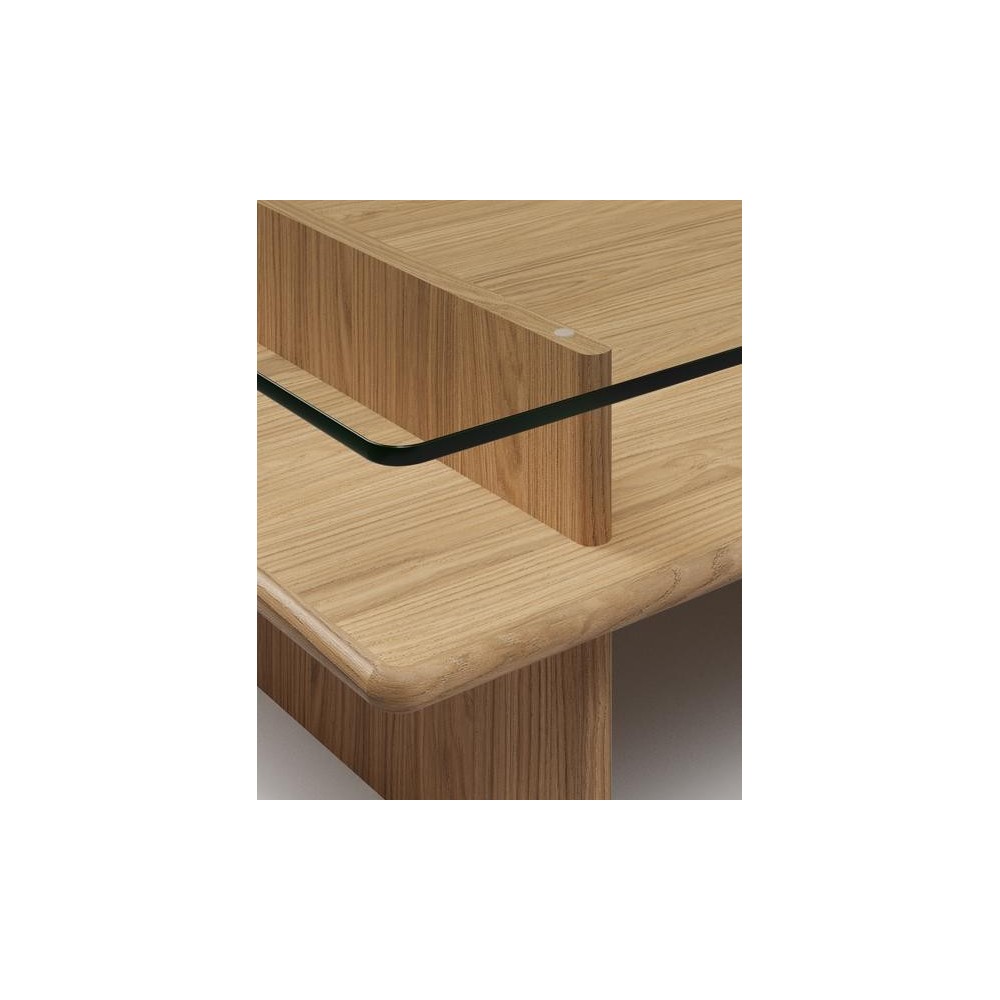 De Parallel salontafel FSC ™ est iDe salontafel Parallel is geïnspireerd op museumvitrines en speelt met de integratie van kunstgalerieën in huis. Dankzij het glas wordt de ruimte tussen de horizontale vlakken een esthetisch uitstalgebied voor boeken en decoratieve objecten in de woonkamer.