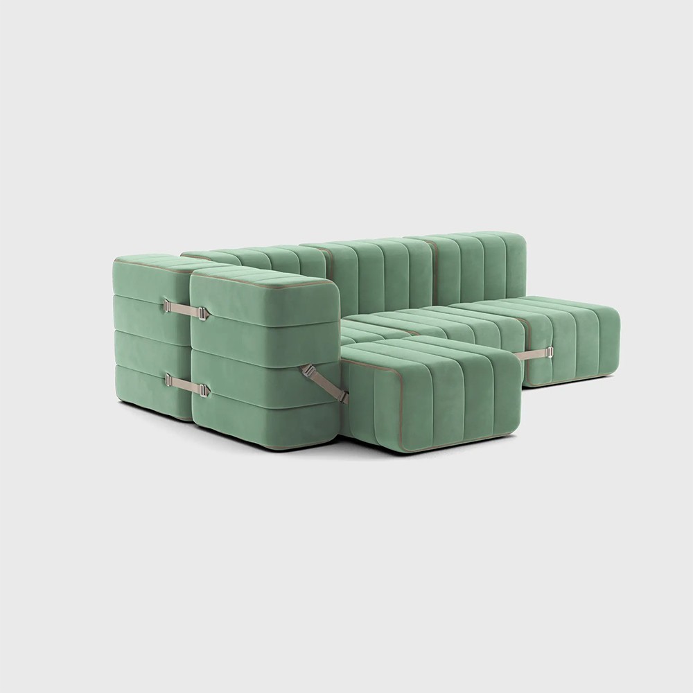 De set van 9 Curt-modules kunnen op zichzelf staan en een asymmetrische fauteuil, bank, loungestoel of kleine individuele krukjes worden. Een paar losse modules zijn genoeg om om te toveren tot een uiterst flexibel en modulair banksysteem en dat op een heel simpele manier: De set van 9 Curt modules bestaat uit verstelbare banden waarmee je eindeloos kunt creëren.