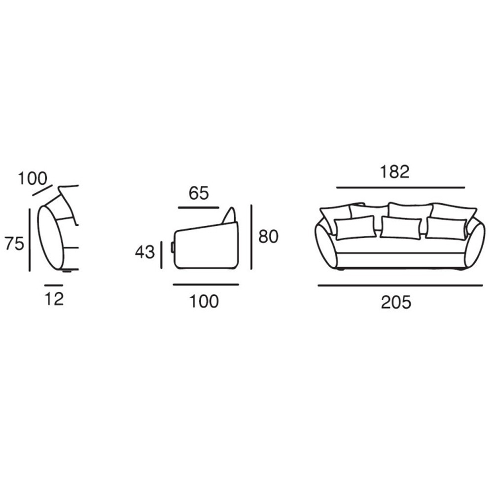 - Largeur : 205 cm | Profondeur : 100 cm | Hauteur : 80 cm | Profondeur d’assise : 65 cm | Hauteur d’assise : 43 cm | Largeur d’accoudoir : 12 cm