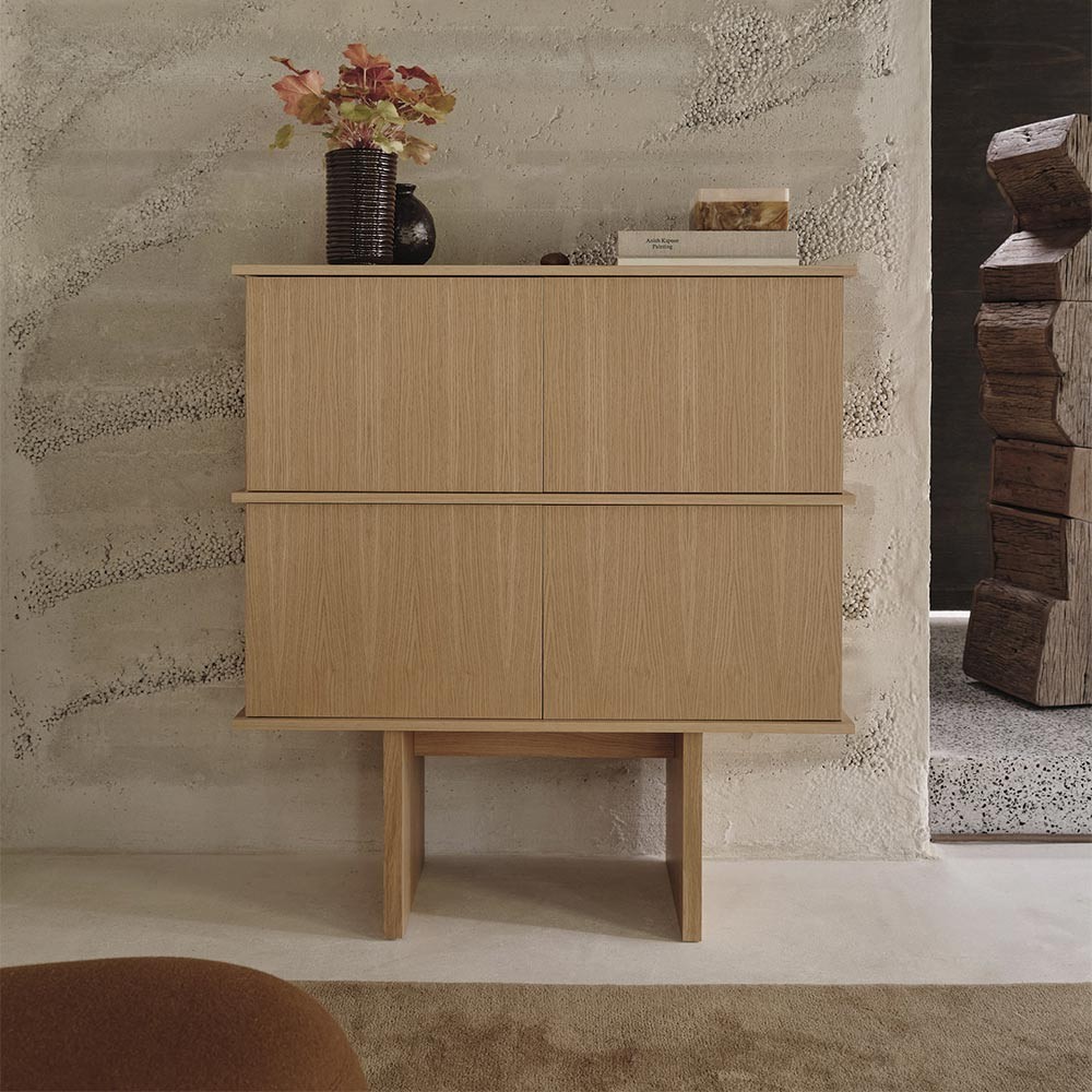 Het Stilt Dressoir is gemaakt van FSC™ Mix gecertificeerd eikenfineer met een kern van CDM en tilt elke kamer op met zijn verfijnde, luchtige uitstraling. Geïnspireerd door de architectonische pilaren die constructies boven de grond of het water verheffen, heeft dit dressoir elegant hoge poten die het onderscheidende en boeiende proporties geven. Dit ontwerpelement voegt visuele intrige en hoogte toe, waardoor het een opvallende aanvulling is op je inrichting. Het dubbele dressoir op stelten heeft royale afmetingen, maakt een opvallend statement met zijn strakke houten verdelingen en is ideaal voor woonkamers, eetkamers of elke ruimte die extra opbergruimte nodig heeft.