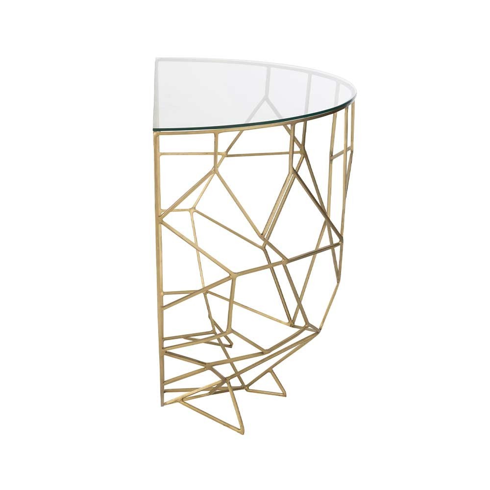 De console Monzaconsoletafel, met zijn vergulde metalen frame en glazen blad, combineert elegantie en minimalisme. Het strakke, chique ontwerp past harmonieus in elke inrichting en voegt een vleugje verfijning toe aan je huis.
