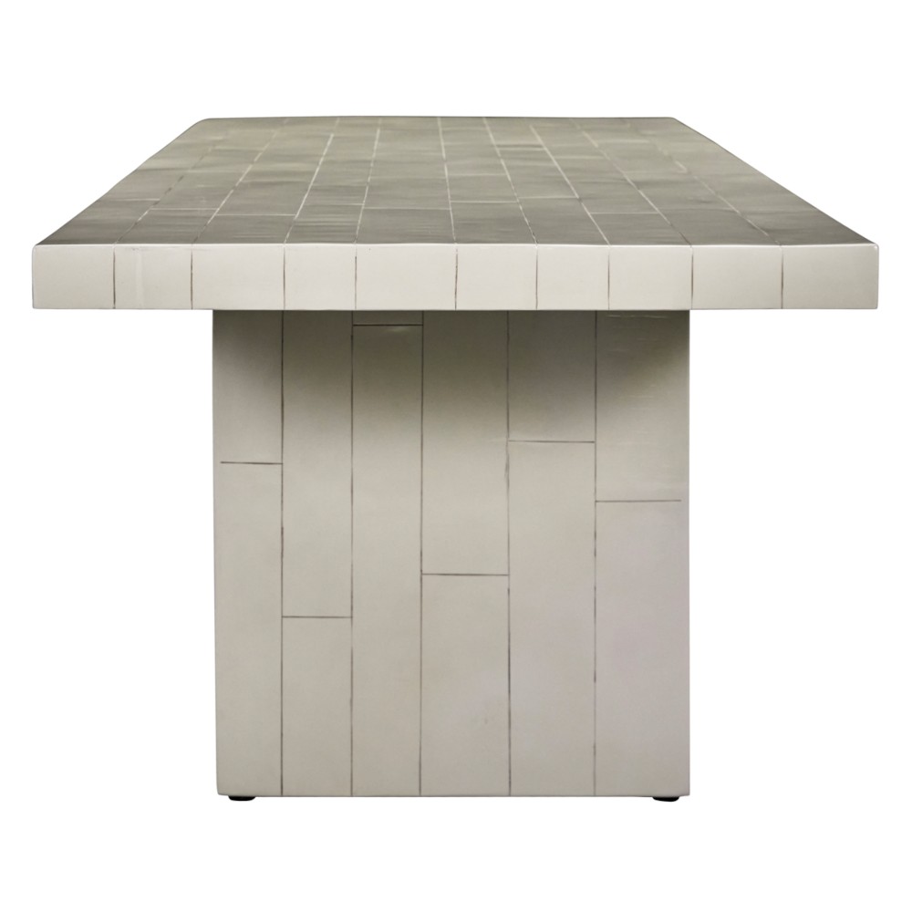 Creëer een ruimte die zowel elegant als uniek is met deze rechthoekige eettafel van mangohouten tegels, afgewerkt met een glanzende zandlak. Het verfijnde geometrische patroon, ritmisch en perfect in balans, is een onmiddellijke blikvanger en geeft het geheel een sterke visuele identiteit. De stevige poten met hun gestructureerde ontwerp versterken zijn aanwezigheid en zorgen voor een solide basis en een zelfverzekerde eigentijdse touch.