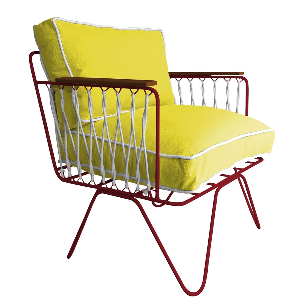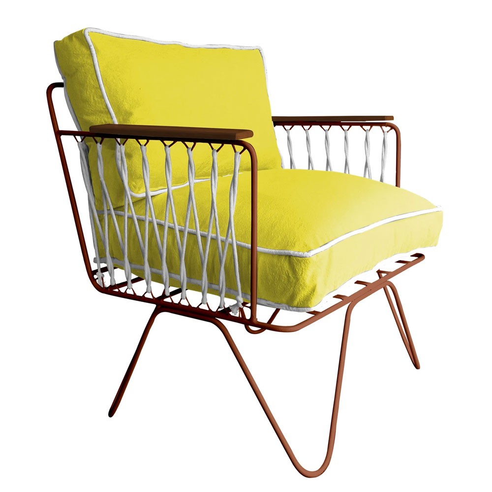 Comfortabel dankzij zijn royale zitvlak en zijn grote zachte rugleuning, doen zijn witte katoenen touwen denken aan die van zeilboten, terwijl het gele katoen van zijn kussens herinnert aan de zon van de Côte d'Azur, de bakermat van de Franse Rivièra-geest die het vrijgeeft.