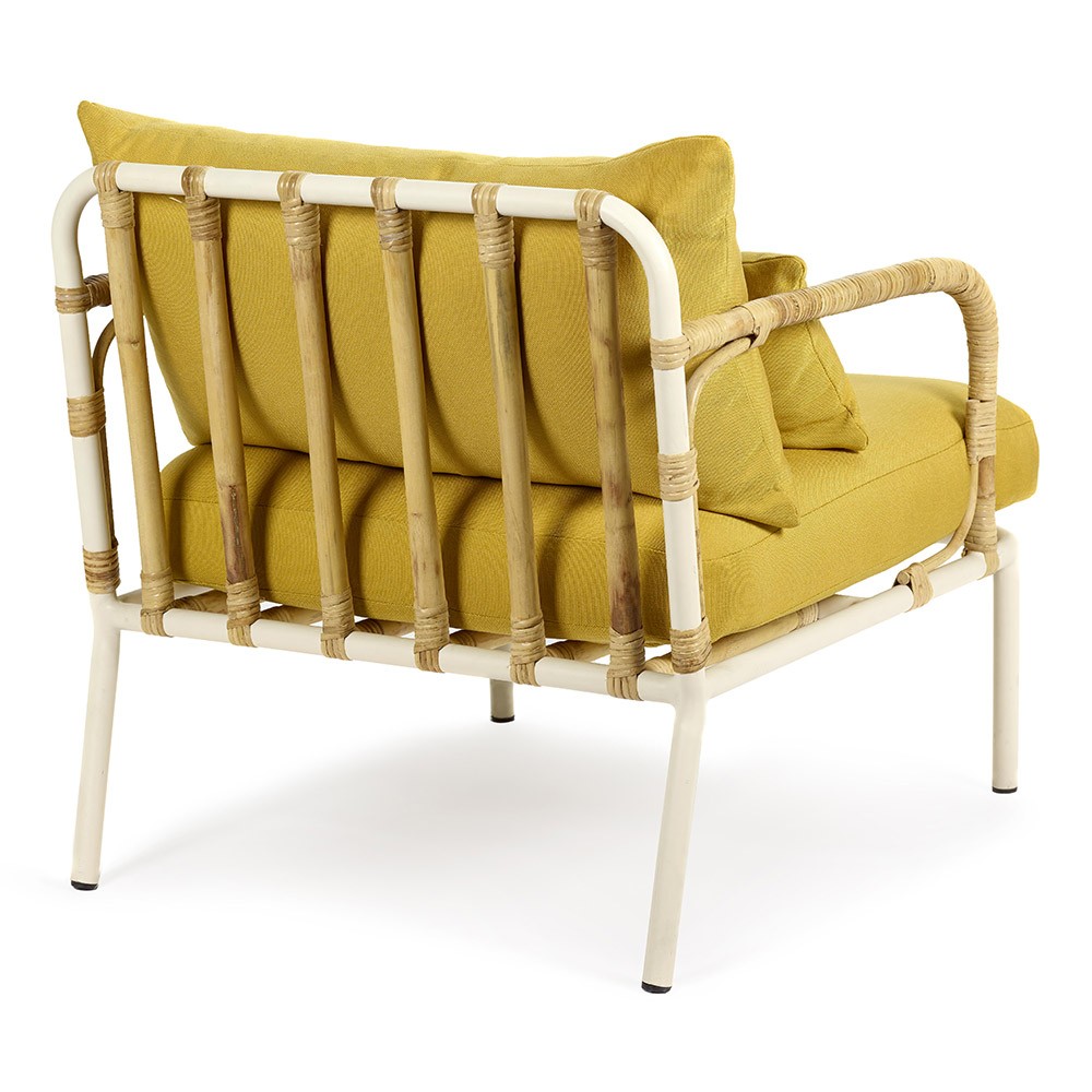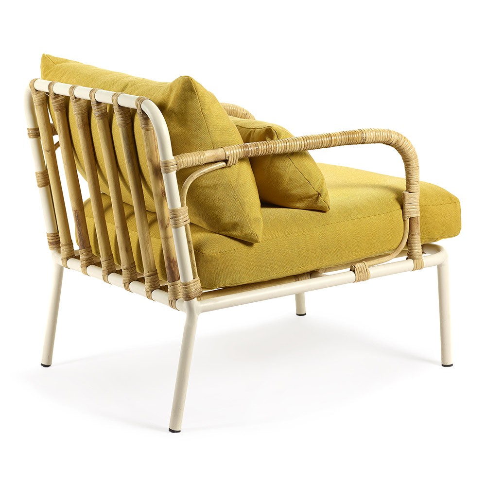 De fauteuil Capizzi combineert op harmonieuze wijze verschillende materialen. Aluminium geeft de stoel een solide basis, terwijl zachtere rotanafwerkingen hem de retro-look geven die de ontwerper zocht. De weerbestendige dikke witte of mosterdgele kussens met of zonder witte rand zorgen voor optimaal zitcomfort.