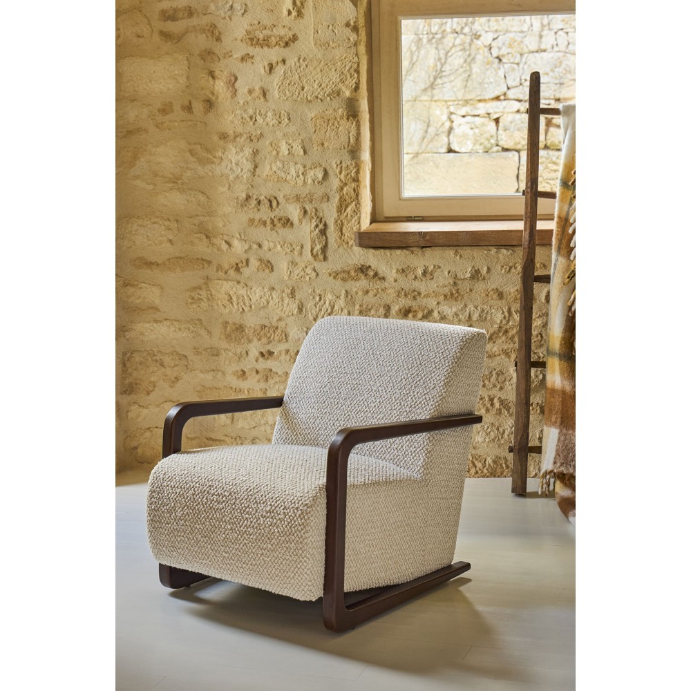Hij is bekleed met een ecru bouclette stof met een zacht, omhullend gevoel en is net zo aantrekkelijk vanwege zijn trendy uiterlijk als vanwege zijn comfortabele zitplaatsen.