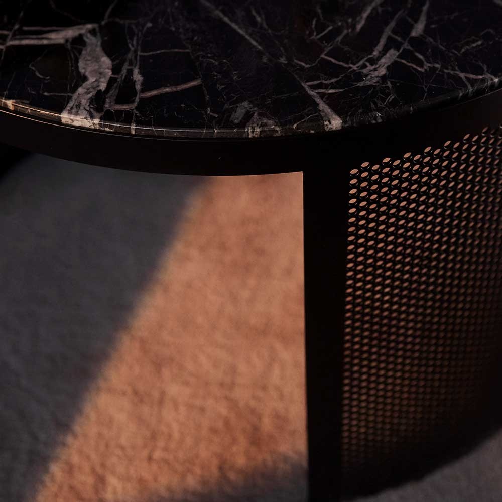 De Pausillus marmeren L salontafel biedt een prachtige mix tussen een retro sfeer en hedendaags design. Zijn lijnen, zijn design, geïnspireerd door een klassieke stijl, passen perfect bij het zwarte geperforeerde ijzer dat een grafisch en delicaat effect heeft. De Pausillus-collectie omvat 3 maten salontafels in 2 kleuren. Alleen nemen ze bezit van de kamer door hun schoonheid; Bij elkaar vormen ze een grafisch volume dat we altijd blijven bewonderen.