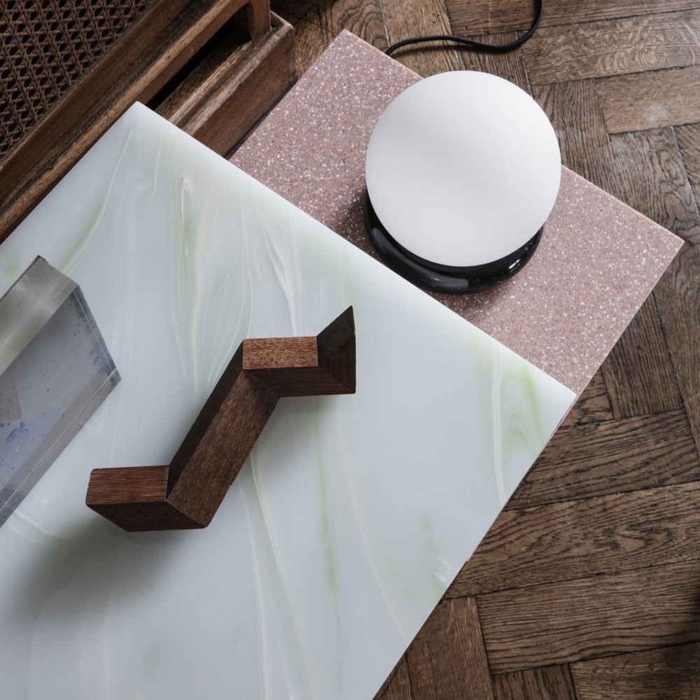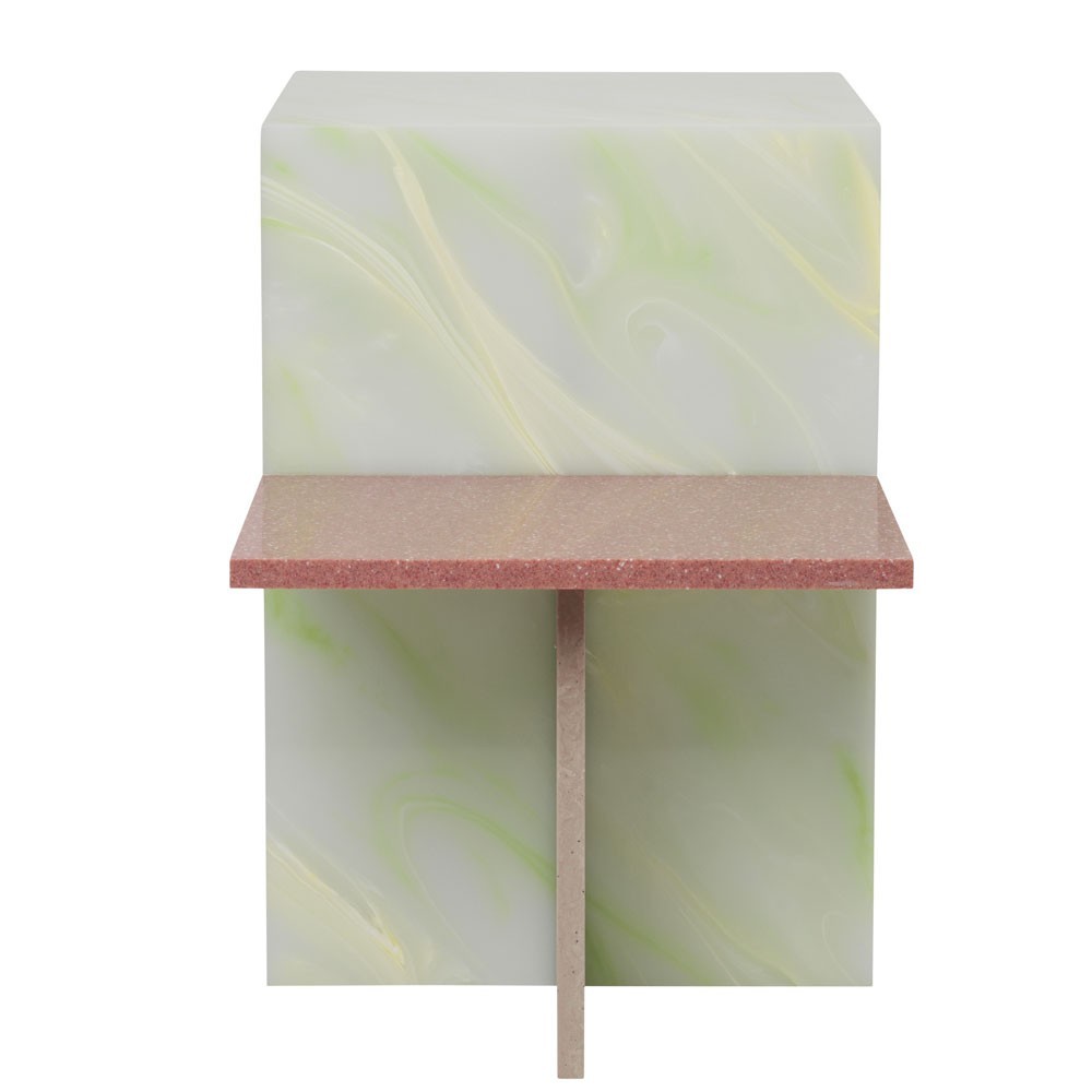 Oorspronkelijk geïnspireerd door Japans minimalisme, verkent de Distinct bijzettafel het creëren van complexe structuren op basis van één enkel element. Het minimalisme van de constructie zorgt voor een contrast met de rijkdom aan texturen en kleuren en herinnert aan een abstract neoplasticisme dat de algehele compositie van de bijzettafel accentueert. De tafel is gemaakt van acrylsteen.