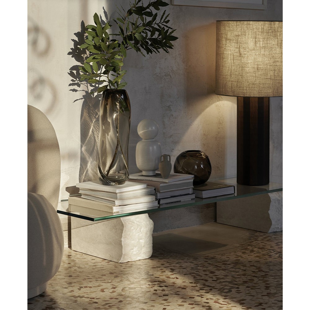 Ontdek de prachtige minerale displaytafel van Ferm Living met een glad, rechthoekig glazen blad geplaatst op een basis van twee stenen blokken aan het uiteinde.