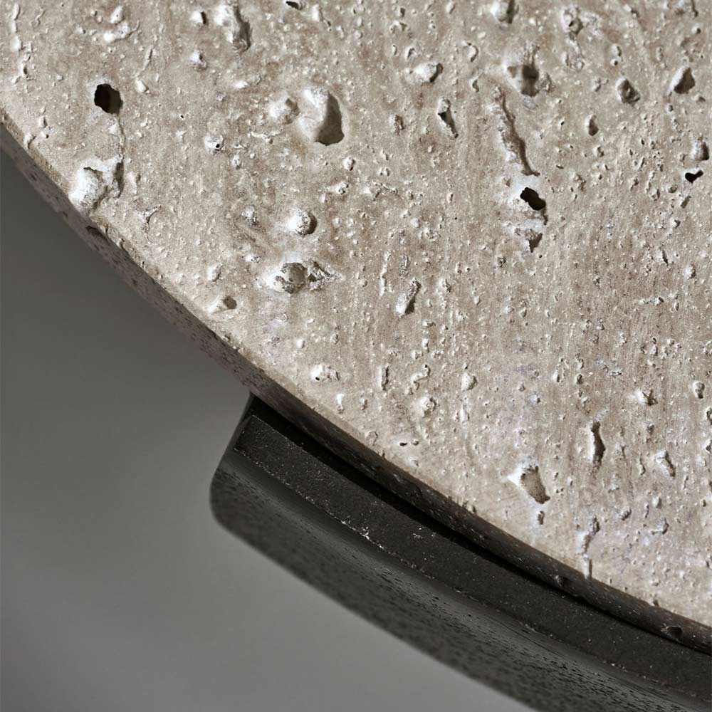 Verfraai de inrichting van je huis met deze prachtige handgemaakte bijzettafel, met een uniek beige travertijnen blad en elegant zwart aluminium onderstel. Elke bijzettafel is anders en geen twee stukken hebben precies dezelfde motieven. Dit is een eerbetoon aan de natuurlijke schoonheid en het individuele karakter van travertijnsteen.
