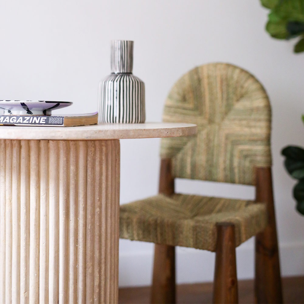 Hoge tafel in travertin, ontworpen door Marion, de oprichtster van THEM, en 100% met de hand gemaakt in Marokko in een van onze getalenteerde partnerateliers.