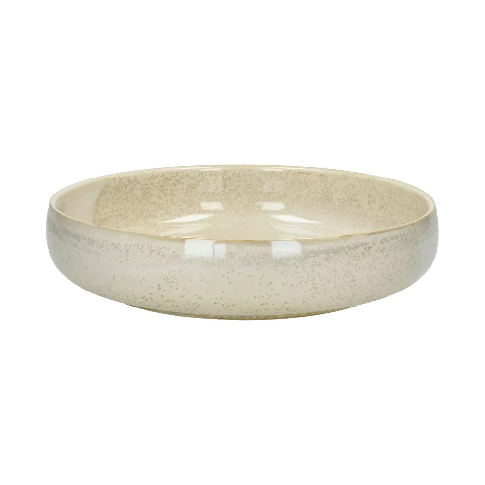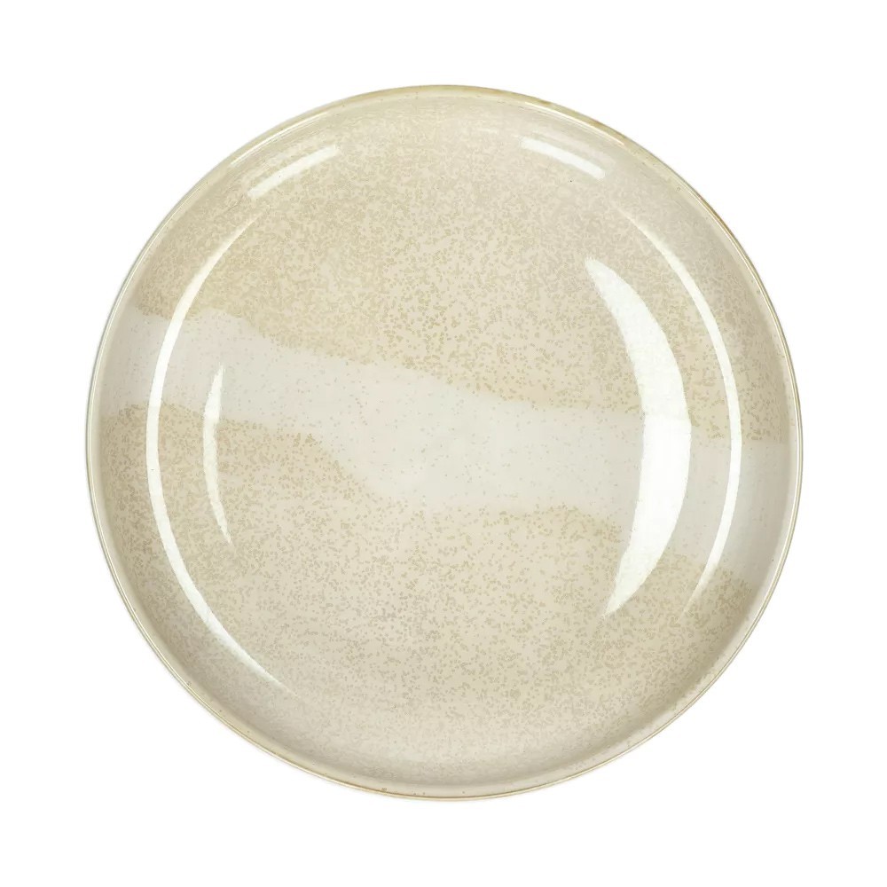 Deze Nougat porseleinen serviesset bestaat uit 8 kommen en borden met afgeronde, opstaande randen. Het is gemaakt met twee soorten reactief glazuur. Beide glazuren zijn met de hand aangebracht met een penseel.
