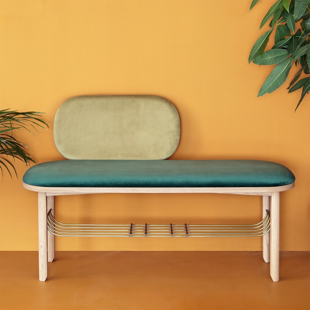 De Eustache entreebank is gemaakt in Portugal, met een massief eikenhouten frame bekleed met fluweel en een koperkleurig gelakt metalen ophangmandje.