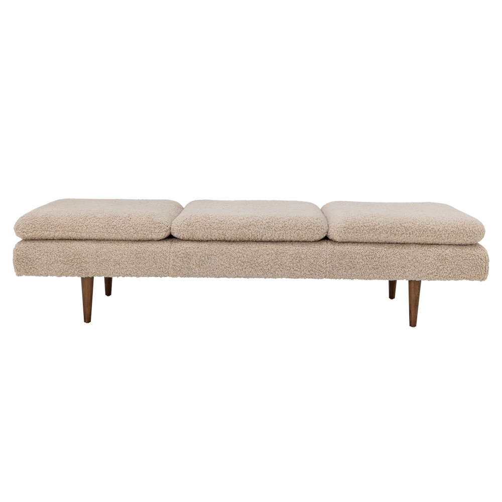 De Pione chaise longue van Bloomingville combineert elegantie en comfort. De zachte stof in neutrale tinten geeft hem een tijdloze uitstraling, terwijl de donkerhouten poten een verfijnd contrast vormen met de lichtgekleurde bekleding. Met zijn strakke lijnen en minimalistische ontwerp past hij gemakkelijk in elke interieurstijl en creëert hij een ontspannend hoekje dat zowel chique als gastvrij is.