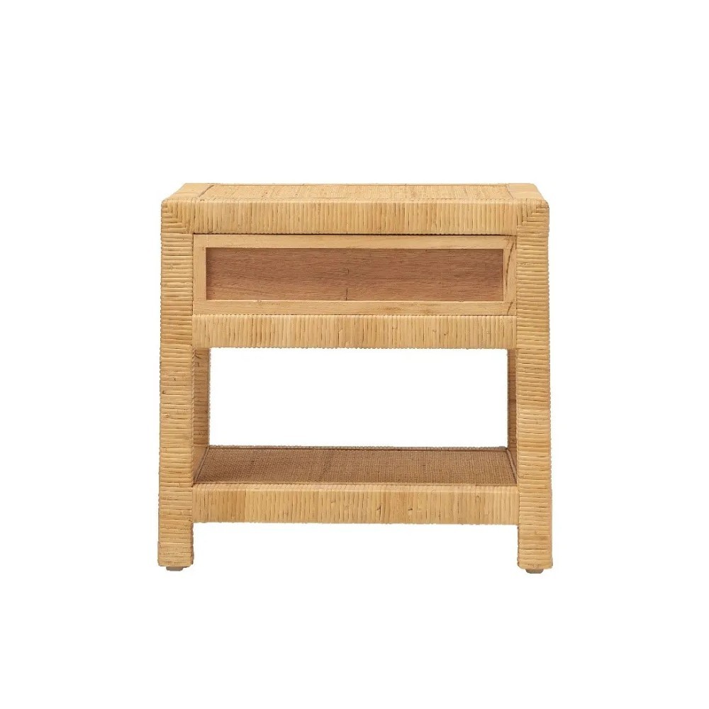 De bovenste plank, gevlochten op een houten basis, biedt een stabiel oppervlak om lampen, boeken of decoratieve voorwerpen op te plaatsen. Compact en veelzijdig, past dit nachtkastje gemakkelijk in kleine ruimtes. Dankzij de discrete lade is het ook ideaal als bijzetmeubel: aan het uiteinde van een bank, als plantenhouder of als extra opbergruimte.