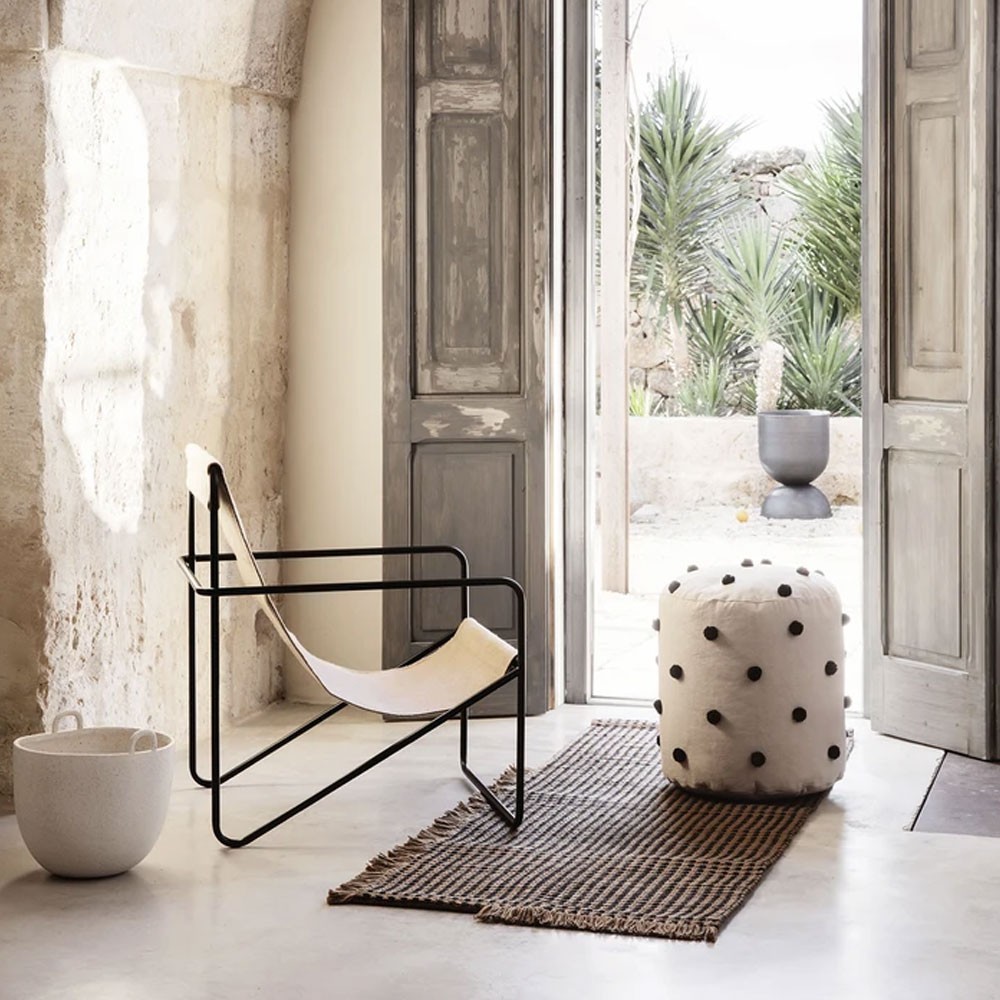 De Desert fauteuil van Ferm Living is samengesteld uit een gepoedercoate stalen structuur en heeft een verwisselbare textiele zitting gemaakt van gerecyclede plastic flessen. Het is geschikt voor gebruik binnen en buiten.