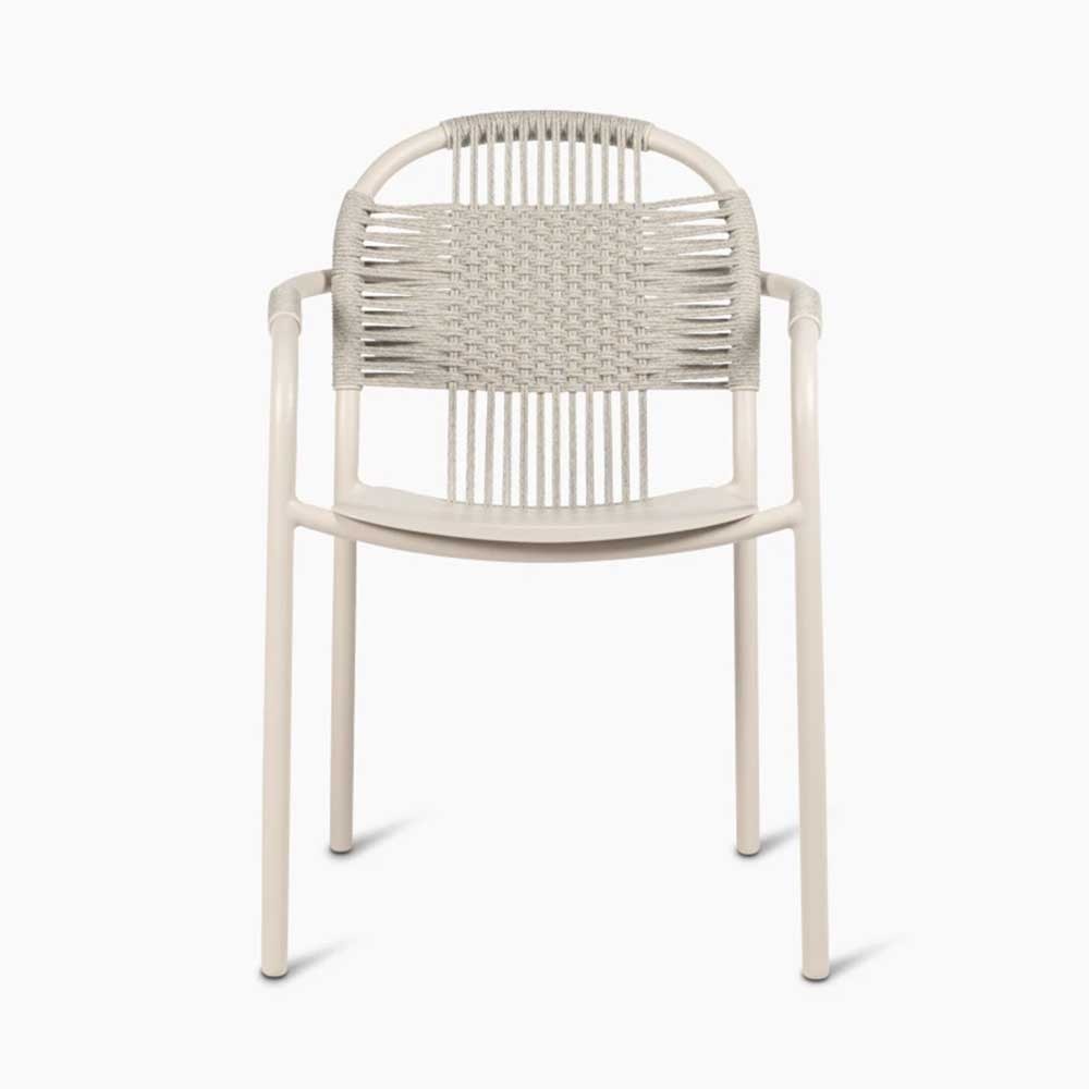 De lichte en stapelbare Cleo stoel is ontworpen voor buitengebruik. Het strakke ontwerp is gebaseerd op twee aluminium constructies: één die de boog van de rugleuning vormt en de andere die rond de rug loopt en de armleuningen vormt. Gevlochten polypropyleen touw vormt de kenmerkende rugleuning en loopt door rond de armleuningen voor extra comfort.