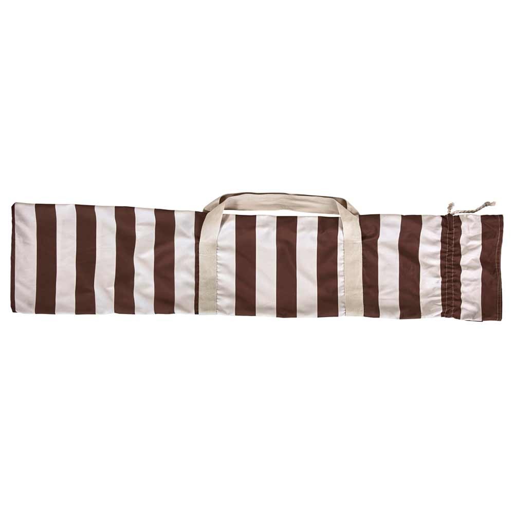 Geef je buitenruimte een stijlvol tintje met deze parasol met klassieke bruine en ecru strepen. Hij is ideaal om schaduw te creëren in de tuin, op het terras of op het strand en combineert functionaliteit met tijdloze stijl. De beukenhouten paal en dikke franjes voegen subtiele verfijning toe aan je buitenmomenten.