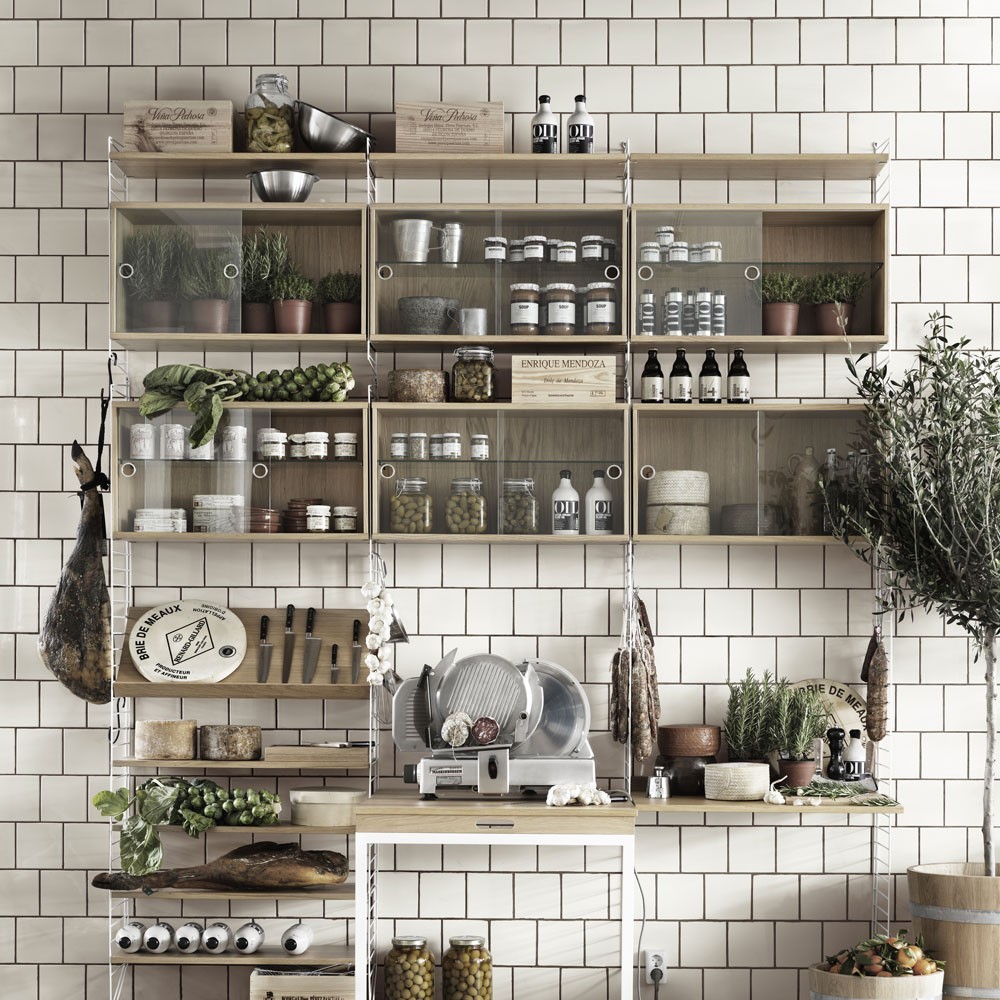 De houten vitrinekast met glazen schuifdeuren kan in een paar eenvoudige stappen in een string® rekkensysteem worden geïntegreerd.