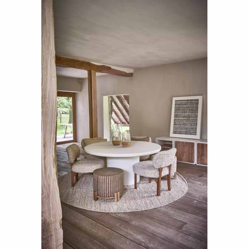 Brindisi, een etnische collectie met handgemaakte details. De handgeborduurde kussens zijn gevuld met veren, waardoor ze heel zacht aanvoelen. Ze hebben ook een dubbel karakter: één kant geborduurd en de andere handgeschilderd. Het textiel op de gedessineerde poef is ook handgeschilderd. En voor wie het liever subtiel houdt, bieden we een neutrale set die volledig bekleed is met een zachte beige boucléstof. De Brindisi collectie brengt een harmonieuze mix van culturele invloeden en vakmanschap in je huis.