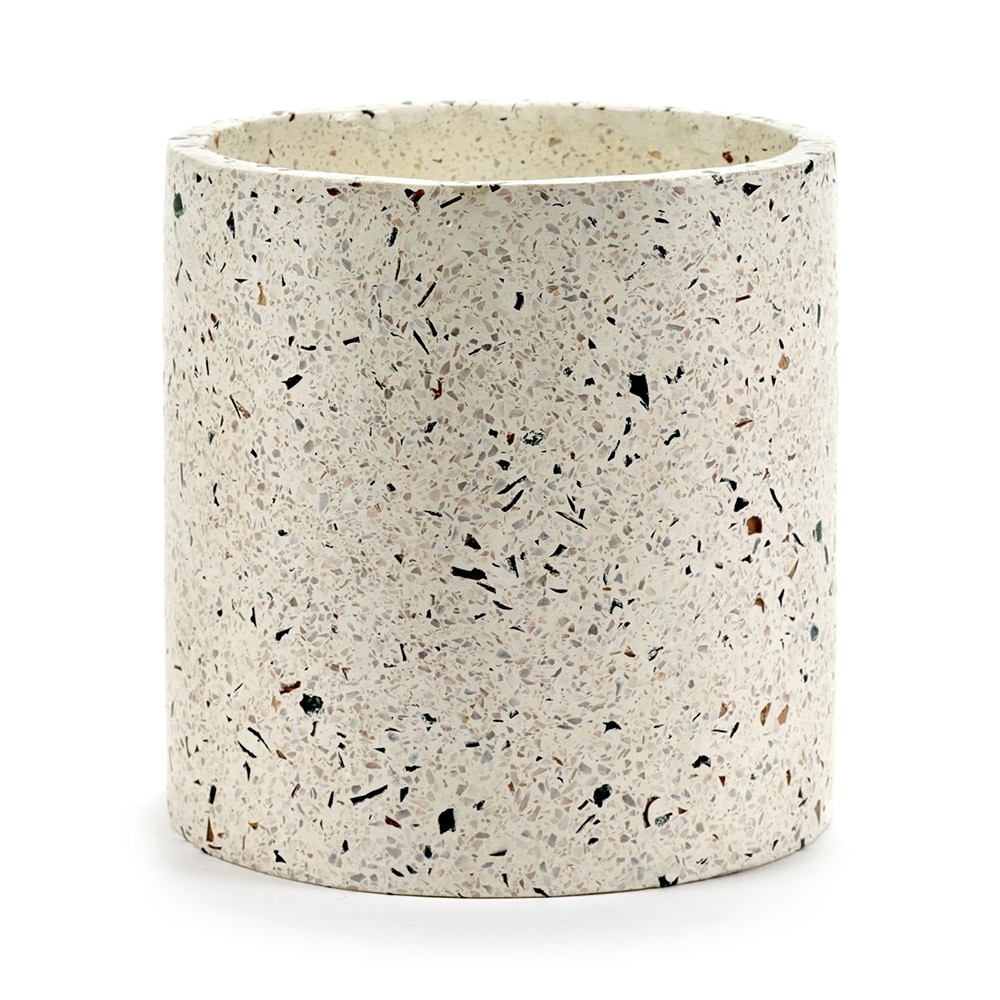 Ontworpen in een blok terrazzo, met een hoogte en een diameter van 25 centimeter, past deze pot zich aan elk gebruik aan, op een tafel, in je woonkamer of aan de voet van de trap, hij zal harmoniëren met al je sferen. Het gespikkelde effect maakt deze pot nog natuurlijker en unieker in zijn soort.