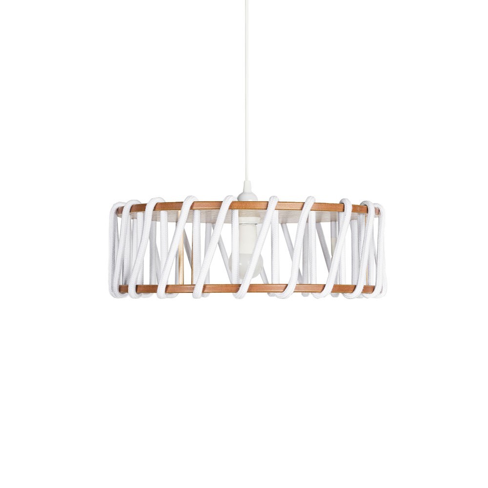 Silvia Ceñal, de ontwerper van deze originele hanglamp, vond inspiratie in de macaron, een fijn gebakje gemaakt met eenvoudige ingrediënten van goede kwaliteit in perfect uitgebalanceerde verhoudingen. Ze hebben altijd dezelfde vorm, die van een afgeplatte bol, maar bieden verschillende kleuren, afhankelijk van de geur. Macaron is een hanglamp samengesteld uit een dubbele structuur in natuurlijk gelakt hout, verweven met een katoenen koord dat dienst doet als lampenkap. Deze armatuur volgt hetzelfde idee als gebak: ze combineert eenvoudige materialen, de verhoudingen en vorm zijn hetzelfde, maar de kleur van het snoer verandert van uiterlijk. De set produceert een origineel, kleurrijk ontwerp dat zo smakelijk is als een macaron zou zijn.