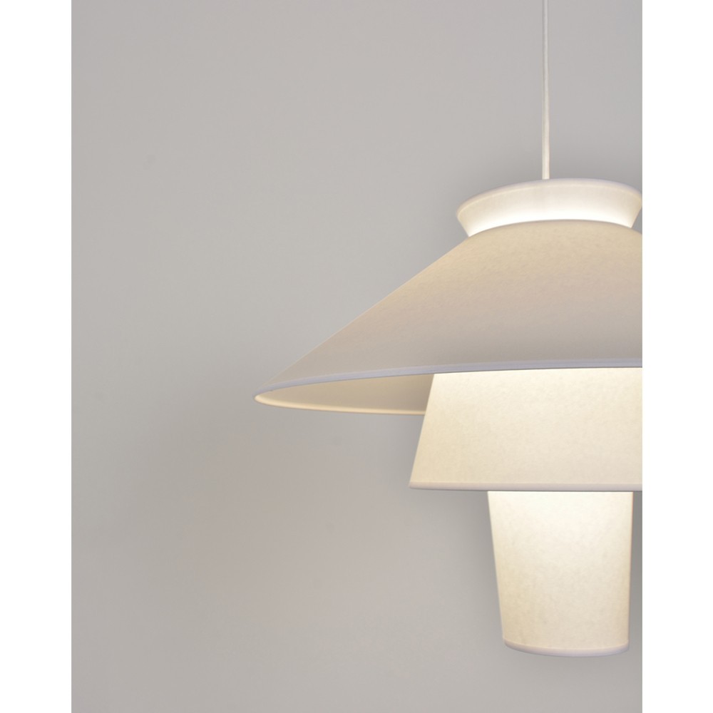 In een designstijl met Scandinavische invloeden doet deze verzameling lampenkappen denken aan de vorm van een gestileerde bijenkorf. De kegels spelen met het licht door het te verspreiden of te weerkaatsen op het gladde, zachte oppervlak van de materialen.