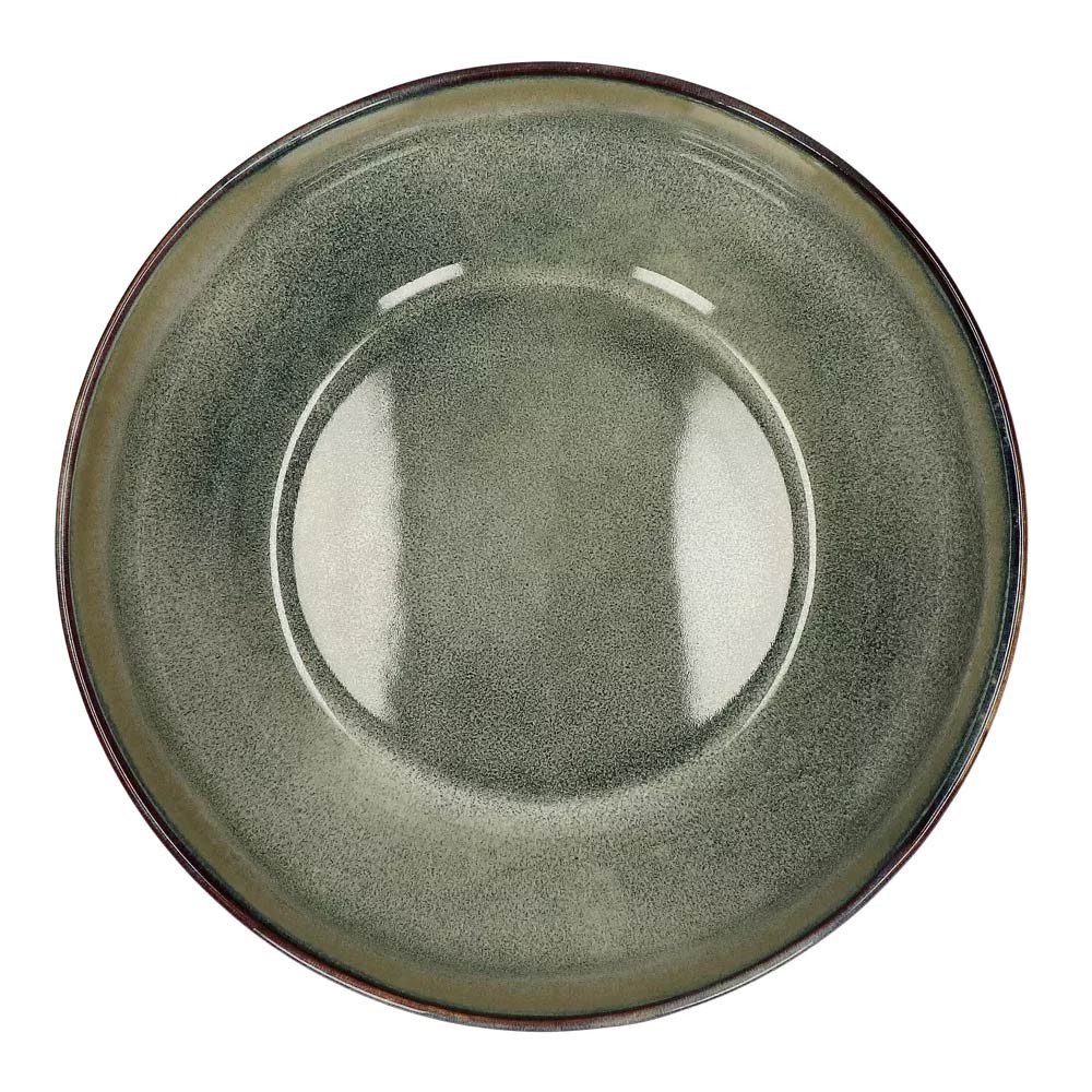 Elk stuk is eerst bedekt met een donkerbruine basiskleur, waarop een lichtere, grijsblauwe tint is aangebracht. Het geheel wordt vervolgens gecompleteerd door een donkerblauwe rand die reageert met de andere twee glazuren, waardoor de bovenste rand het kleurenpalet van een mooie herfstavond krijgt.