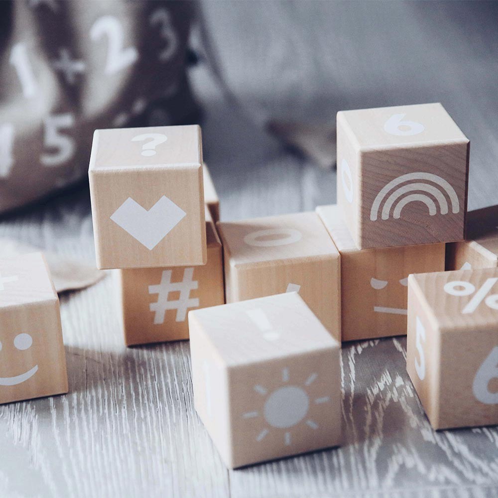 Deze tien houten rekenblokken, gemaakt door ooh noo, zijn perfect om esthetiek en educatief spel te combineren. Ze zijn samengesteld uit getallen van 0 tot 9 die vier keer worden herhaald, elementaire wiskundige symbolen en leestekens, vier emoji's naast een regenboog, een zon, een maan, een ster en een hart. Uw kind zal veel plezier beleven aan het leren van de cijfers!