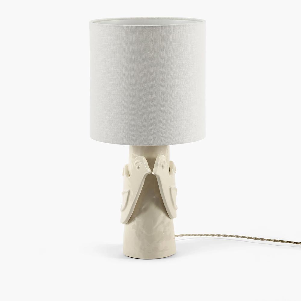 De klassiek vormgegeven sfeerlamp Paloma heeft een opvallende voet met een neutrale linnen kap. De lamp, versierd met een handgemodelleerde duif, doet denken aan de schetsen van Picasso en is een eerbetoon aan de dochter van de schilder, Paloma. De drie kleuren die Marie koos voor het keramiek - donkerbruin, warm rood en de natuurlijke kleur van de klei met een kleurloos glazuur - zijn gebruikt. Het snoer, gewikkeld in zwarte of witte gedraaide stof, geeft de lamp een elegante touch.