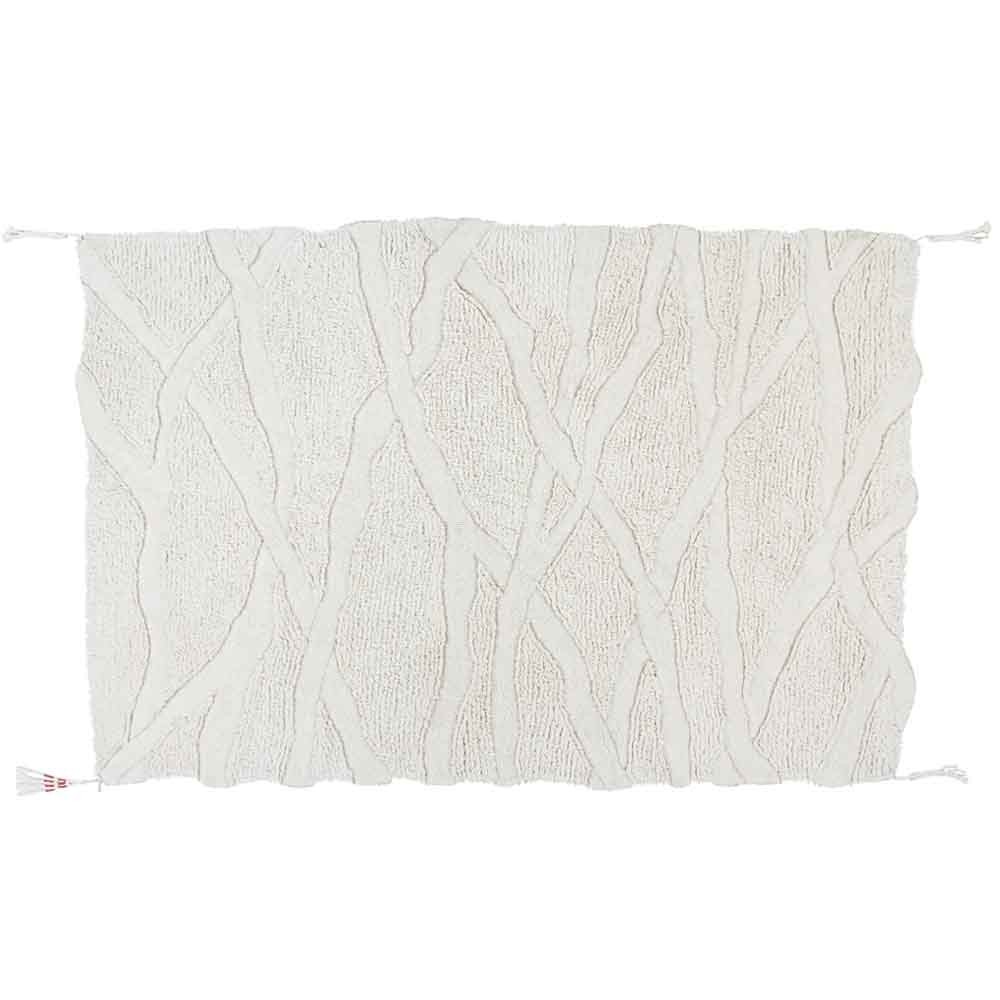 Rechthoekig wollen vloerkleed met een onregelmatige rand, gemaakt met contrasterende vlakken van korte en middelhoge poolhoogte, waardoor een subtiel patroon ontstaat dat is geïnspireerd op de acaciahouten hekken van tribale dorpen. Op elke hoek is een handgemaakte vlecht bevestigd, gemakkelijk te verwijderen tijdens het wassen.