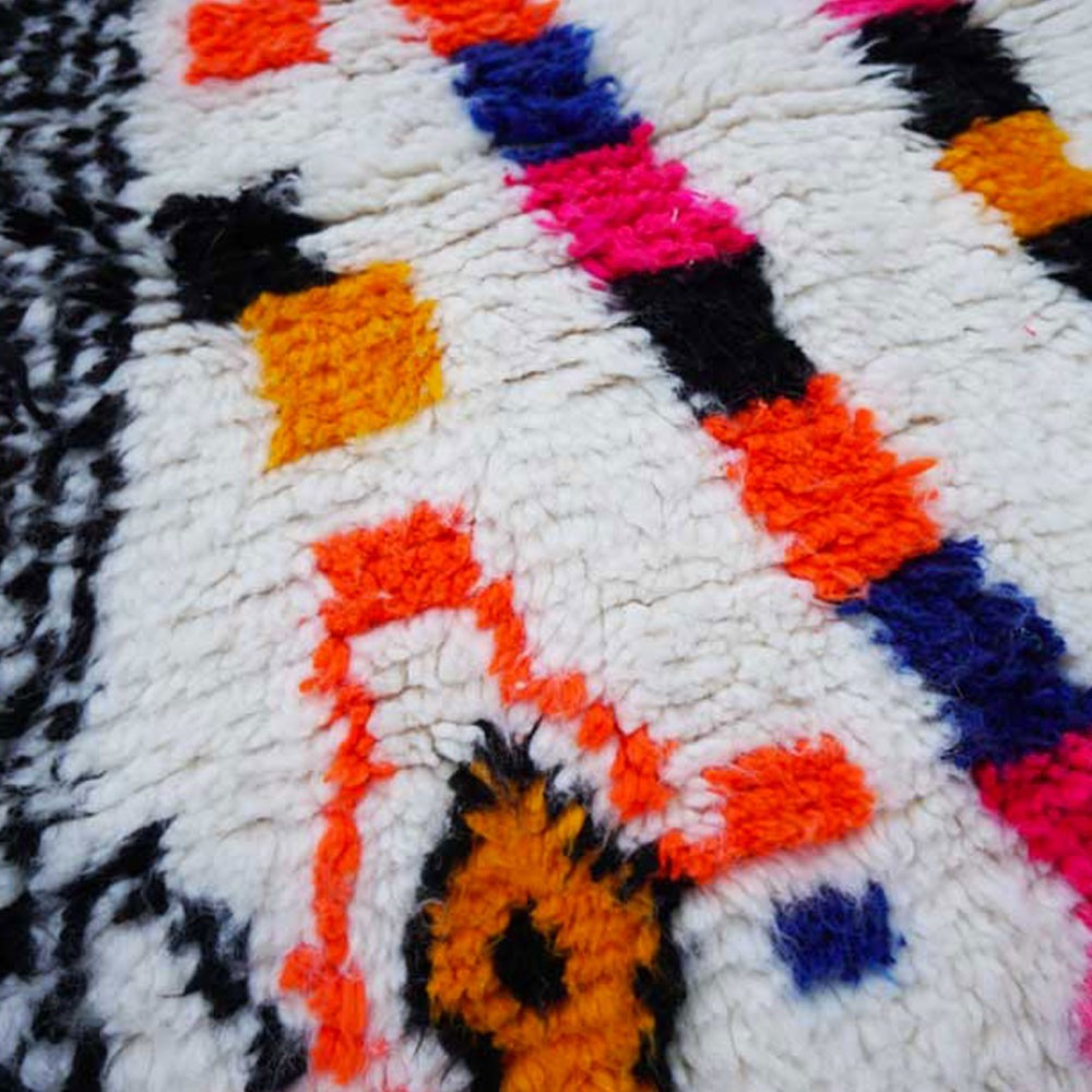 Dit tapijt genaamd Azilal ontleent zijn naam aan de regio Azilal in het Atlasgebergte in Marokko, waar het werd gemaakt. Elk stuk is 100% handgemaakt op een traditioneel weefgetouw. Het kost meer dan twee maanden weven om een middelgroot vloerkleed te maken.