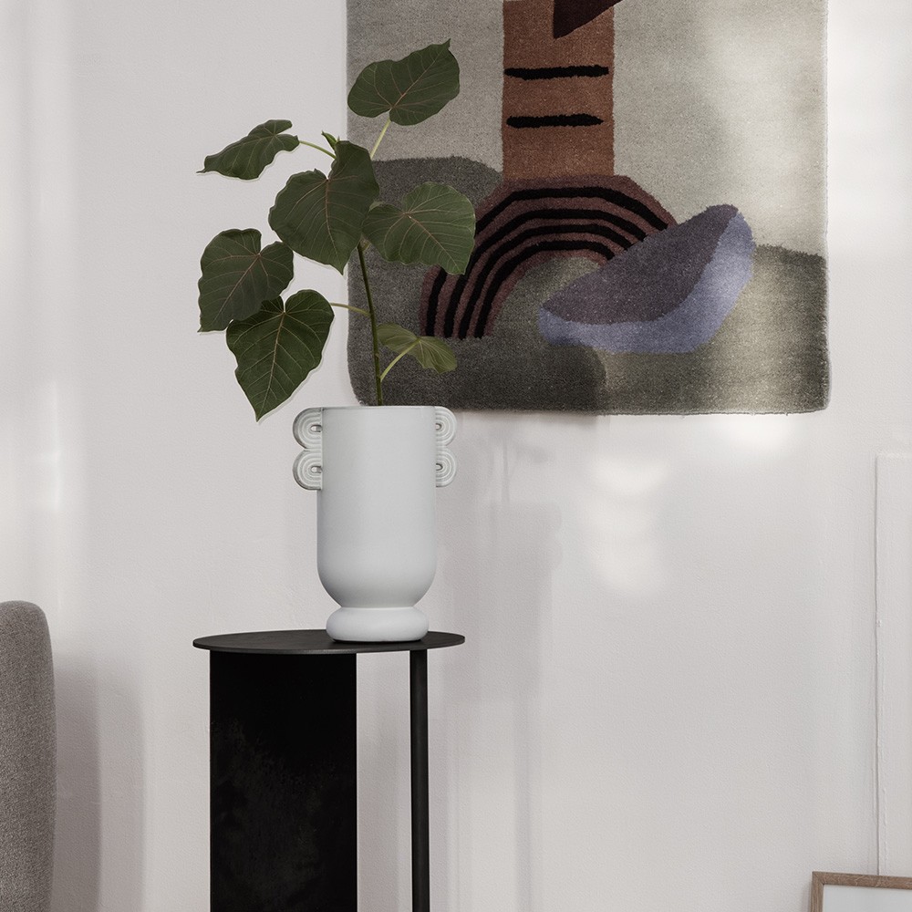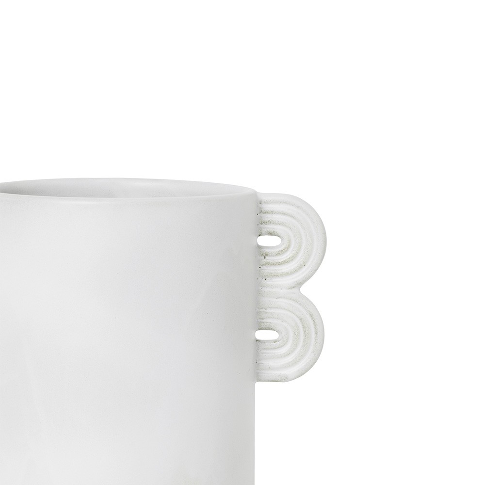Deze mooie kleine vaas Ania, van Ferm Living, behoort tot de elegante collectie Muses vazen van het merk. Deze zijn gemaakt van geglazuurd keramiek en lijken min of meer op alledaagse voorwerpen. Hier is de Ania-vaas geïnspireerd op het ontwerp van een trofee, met een kleine platte basis aan de onderkant en vervolgens met een structuur die een kopje vormt aan de bovenkant, plus twee kleine decoratieve handvatten. Met zijn even moderne als verfijnde uitstraling zal deze vaas perfect zijn plaats vinden in uw huis. In de woonkamer, entree of kantoor, op tafel of op de vloer, de mogelijkheden zijn eindeloos om van deze vaas een pronkstuk in huis te maken.