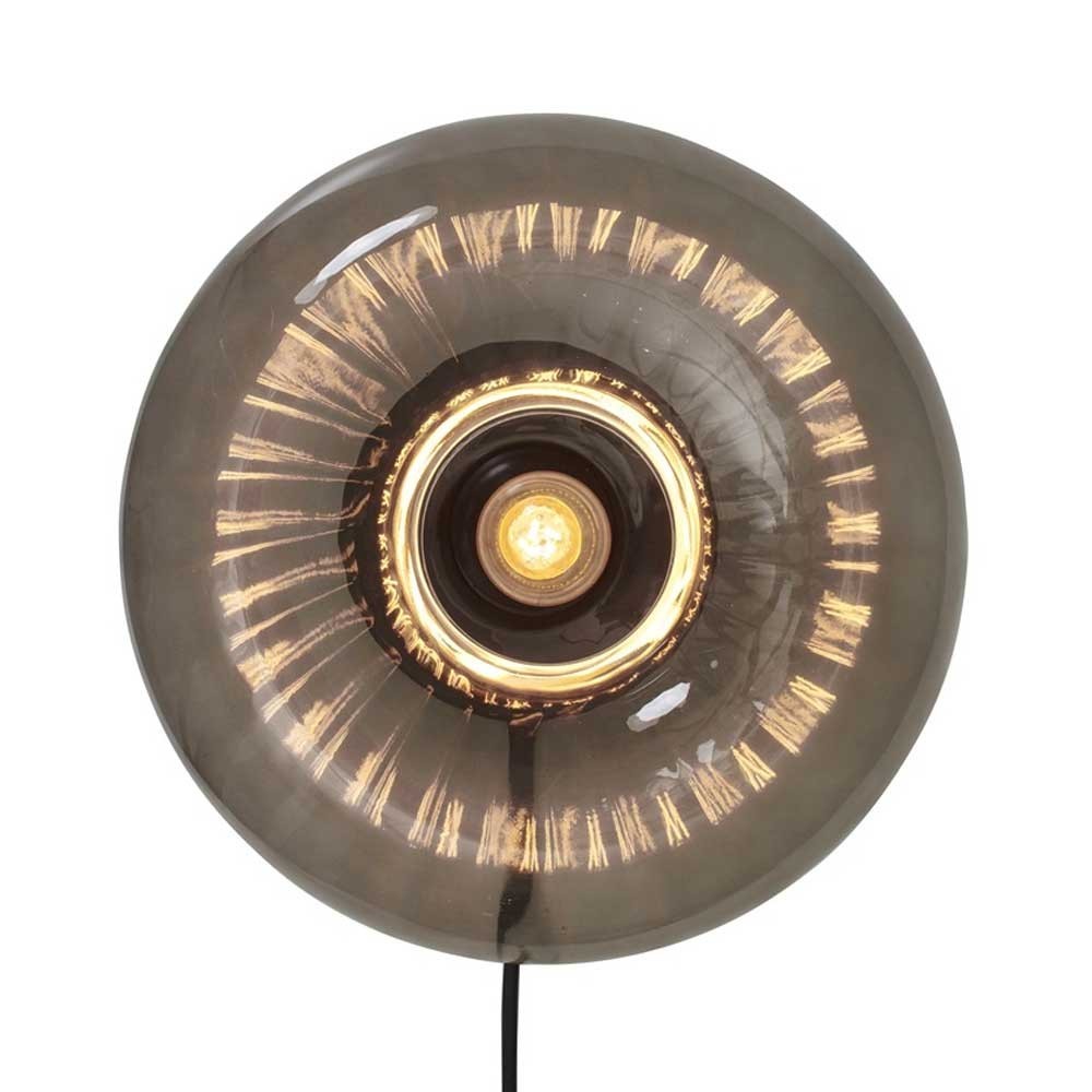 Halverwege tussen wanddecoratie en lamp, is de Russel lamp een uitzonderlijk stuk, ontworpen door het merk waar het om gaat RoMI. Gemaakt van glas en metaal, wordt deze lamp aan de muur gehangen en ingeschakeld door een geïntegreerde schakelaar. Door het licht te verspreiden ontstaat een aantrekkelijk cirkelvormig patroon dat de aandacht trekt. De zichtbare lamp geeft hem een vintage look die karakter zal toevoegen aan uw inrichting. Deze lamp is verkrijgbaar in transparant en antracietgrijs.